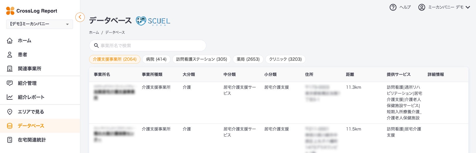 SCUELが保有する医療機関・薬局・介護事業所の施設データをもとに、CrossLog Report上に診療圏マップを自動生成する機能を実装しました。自院を中心としたエリアにどのような事業者が存在しているのかを直感的に把握でき、以下のような用途でご活用いただけます。
