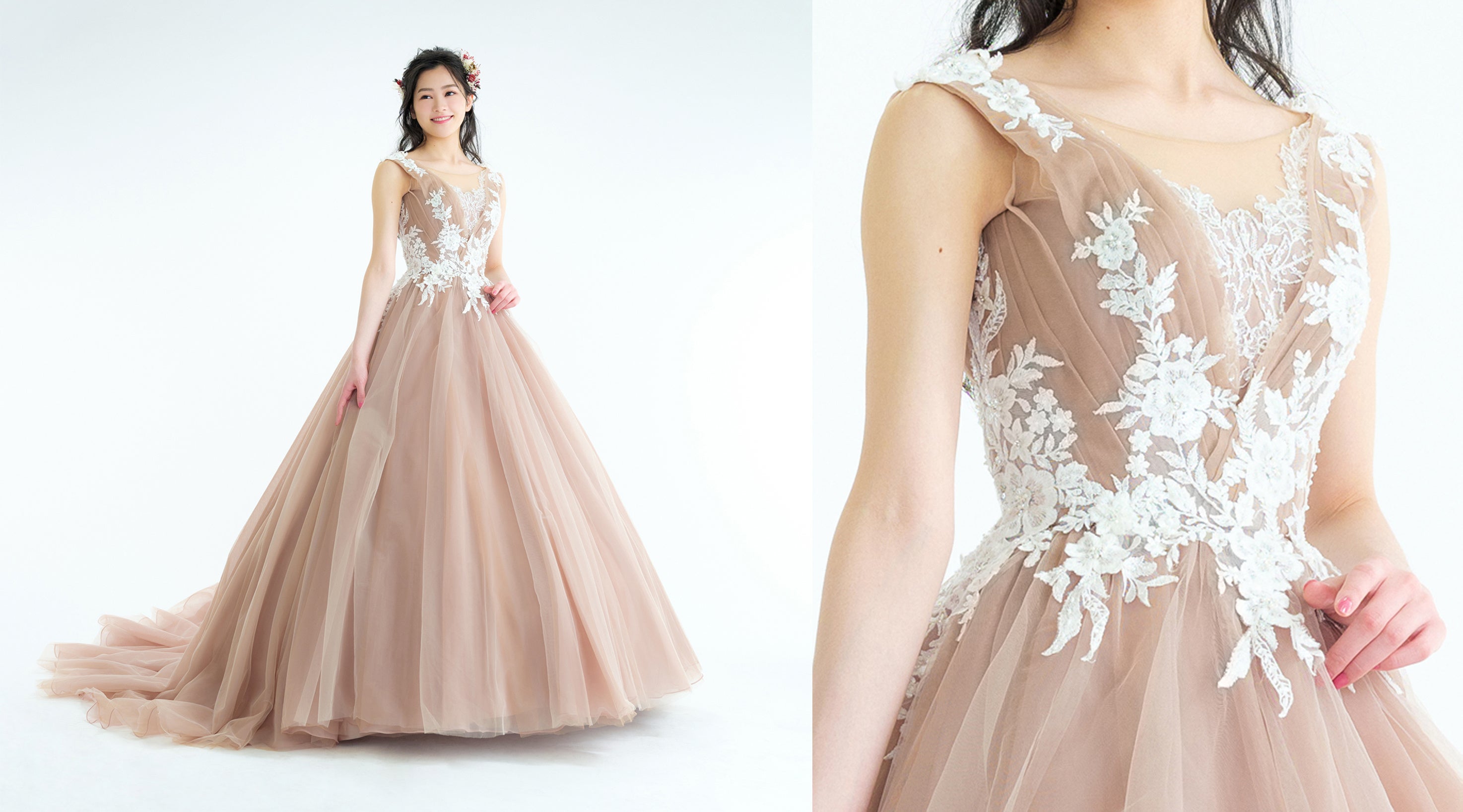 ロマンチックで大人かわいい、モカブラウンの上品なドレス。2色のチュールが揺れるたび、陰影ができ深みのある美しさを演出いたします。胸元のVラインにあしらわれた繊細なレースがウエストラインを綺麗に、さらに小顔効果にも期待が。一際女性らしく、美しく見せてくれる1着です。