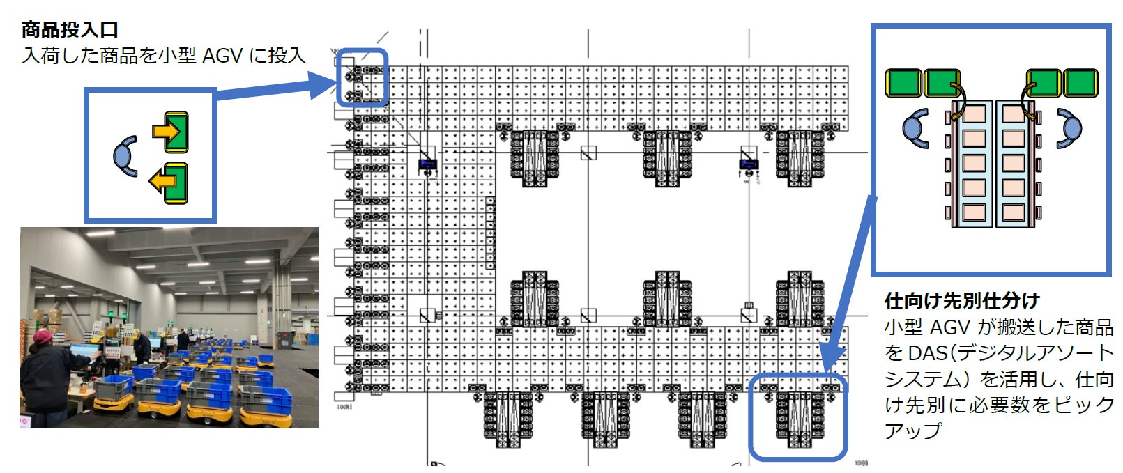 この次世代型物流システムは、複数の小型AGVが稼働する「T-Carry system」を採用。入荷商品をすぐに出荷先別に仕分けていく通過型物流センター※における最適な仕分け工程を実現しました。また、物流センター内業務を最適化するデータ分析サービス「Nexa Warehouse-Optimizer」を付加することで、作業エリア別負荷状況の可視化や、現場状況に応じた作業員の適正配置などさまざまなサービスを提供しています。