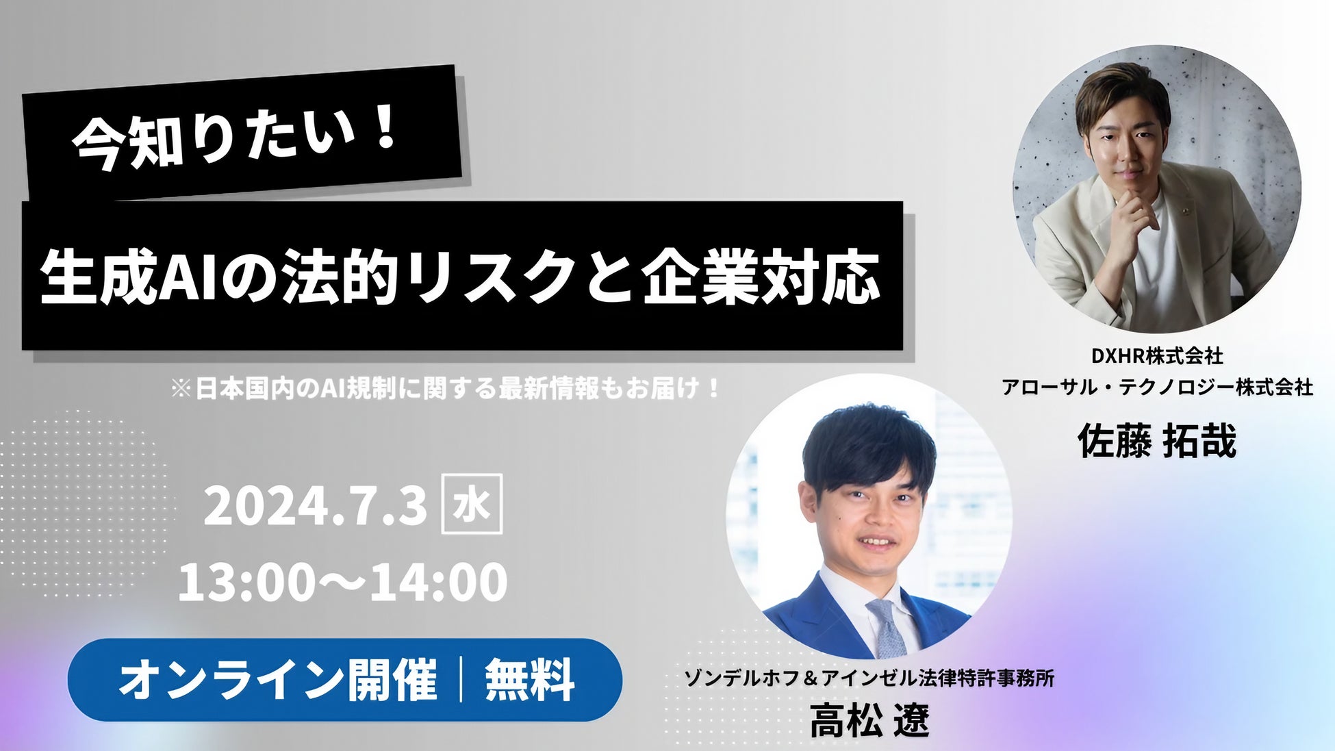 DXHR株式会社は、ゾンデルホフ&アインゼル法律特許事務所から高松遼弁護士を迎え、2024年7月3日(水)に「生成AIの法的リスクと企業対応」をテーマにした無料オンラインセミナーを開催します。