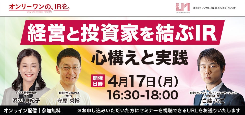 株式会社リンクアンドモチベーション(本社:東京都中央区、代表:小笹芳央、証券コード:2170)のグループ会社、株式会社リンクコーポレイトコミュニケーションズ(本社:東京都中央区 代表:白藤大仁)は、経営と投資家を結ぶIRをテーマに無料WEBセミナーを開催します。