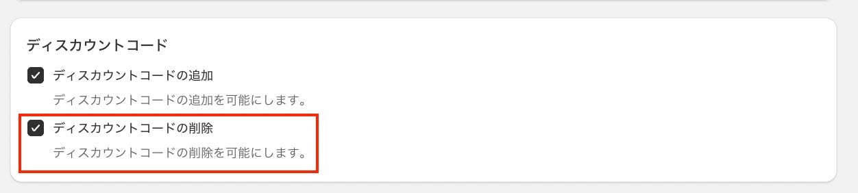 ※お客様アカウントページでディスカウントコードの削除を有効にするには、アプリ管理画面のお客様アカウントページ設定ページで「ディスカウントコードの削除」にチェックを入れる必要がございます。