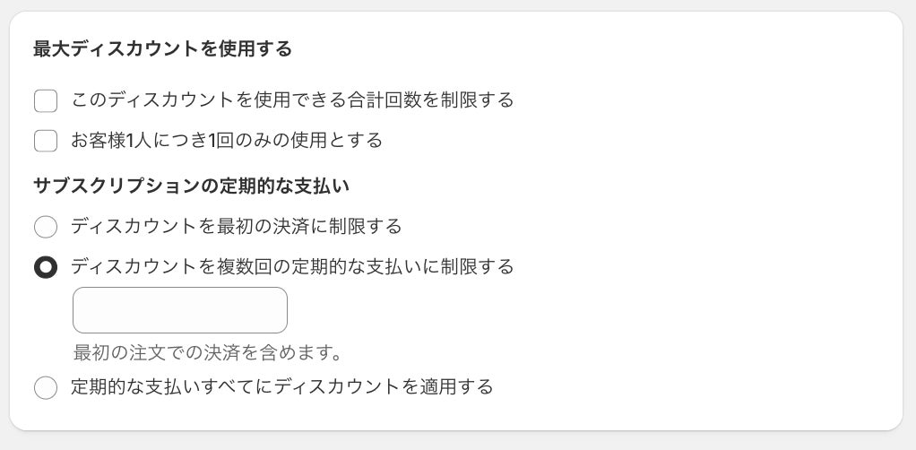 ※Shopifyの仕様により、契約からクーポンを削除して再追加すると、Shopifyディスカウント設定で「ディスカウントを複数回の定期的な支払いに制限する」がリセットされますので、ご注意ください。