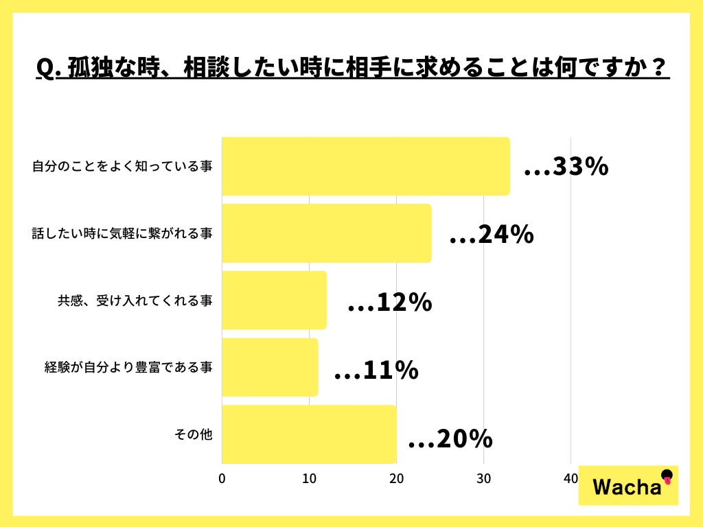 孤独な時、相談したい時に相手に求めることとして最も多かったのは「自分のことをよく知っていること」で33%でしたが、「話したいときに気軽に繋がれること」や「共感、受け入れてくれること」といった、タイミングや共感してくれる事を重視する傾向も見られました。