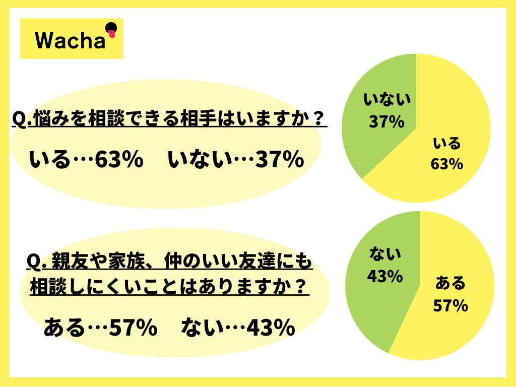 悩みを相談できる相手がいると回答したのは63%という結果に対し、「親友や家族、仲のいい友達にも相談しにくいことはありますか?」という質問に57%が「ある」と回答しており、親密な関係性の相手にさえも相談をためらうことがあるという結果となりました。