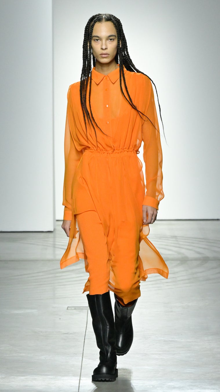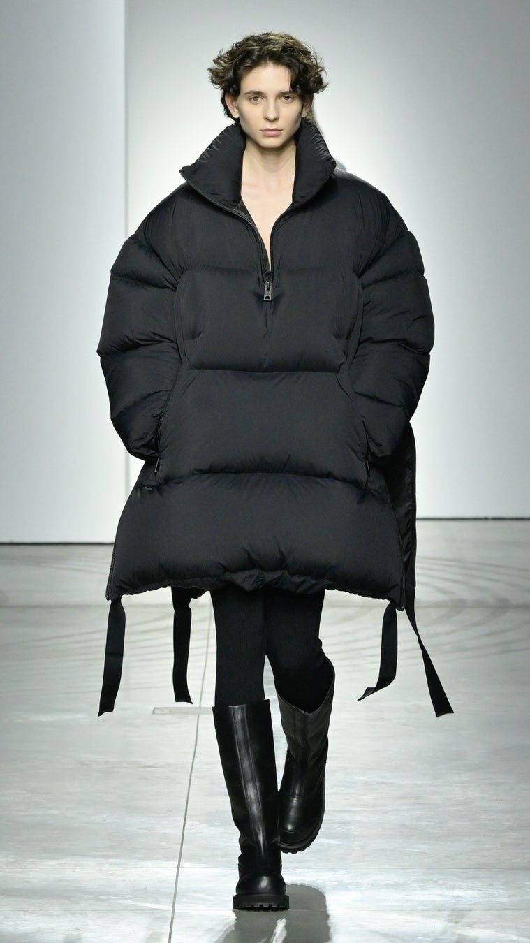 対照的なのが、アルペンのダウンヒルスーツを想起させるタイトフィットのスーツ。その上には、フレンチテリーのフーディーに代り、モヘアタッチのニットでつくられたジャイアントタートルネック、パディングがシースルーに見える(アウターウェアの装飾としても登場するディテール)軽量キルティングシフォンのシャツ、リブ編みのタイトなシルエットのタンクトップなどが組み合わされています。ジョーゼットやシフォンのドレスのウエストにデザインされたサッシュベルトやドローストリングは女性らしさを強調し、ロング丈、ショート丈ともに流れるようなシルエットです。