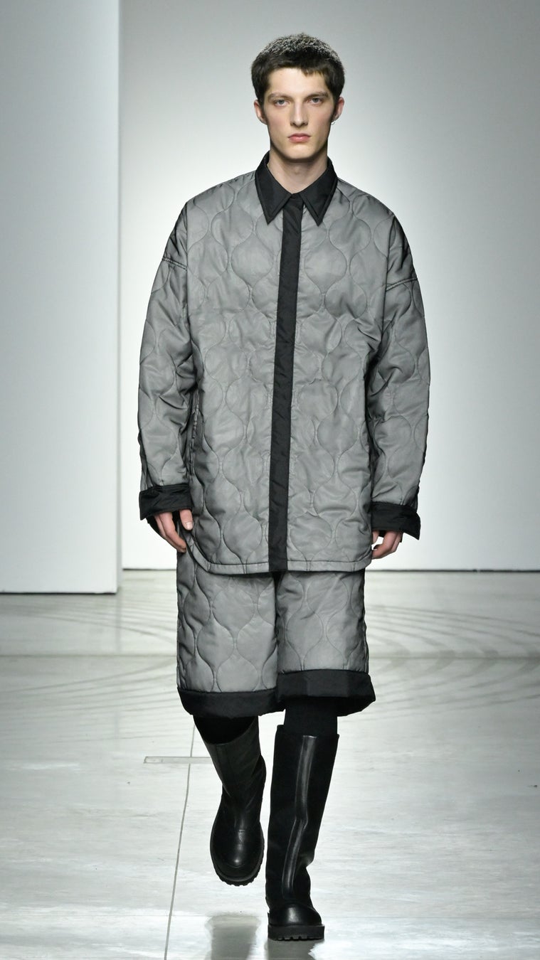 どのアイテムにおいても、重ね着してもシルエットにボリュームが出るだけで、かさばりにくいのが特徴です。ルックを完成させるのが、ボトムスのレイヤリング。ナイロンとメルトンのバギーパンツ、パディングがシースルーにみえるキルティングシフォンのショートパンツは、重厚感のあるボクサーショーツの上に重ね着します。