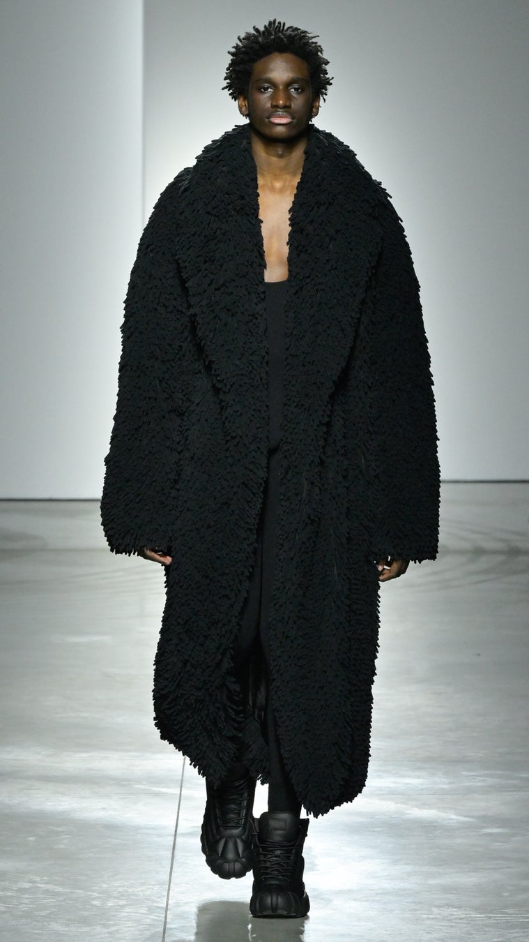 ニードルパンチ加工を施したクラフティッドエコファーのオーバーサイズコート。背中のパディングがシースルーに見えるディテールを施し、大きなニットのマーチンゲールを飾った、肌触りのよいメルトンのテーラードコート。シャリ感のあるメルトンはオーバーサイズの3つボタンのジャケットやコートに用いられています。