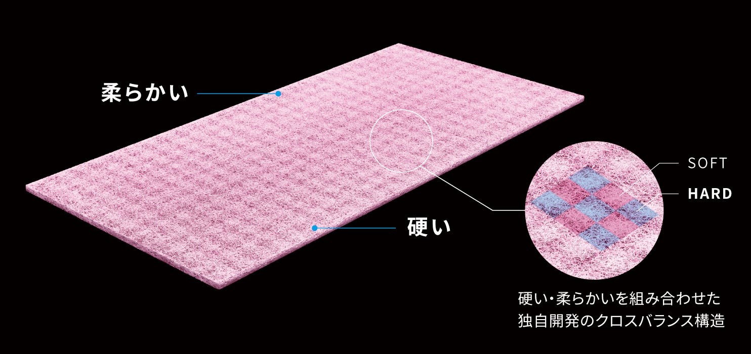リカバーレイの核となるクロスバランス構造は、高反発樹脂素材を強弱の格子状に編み込むことで実現。40年の臨床経験を持つ作業療法士が、「従来の寝具のように体圧分散するだけではなく、それぞれの骨を受け止めるように支えるとその周りの筋肉の緊張は緩む」という発想を形にした奇跡のマットです。