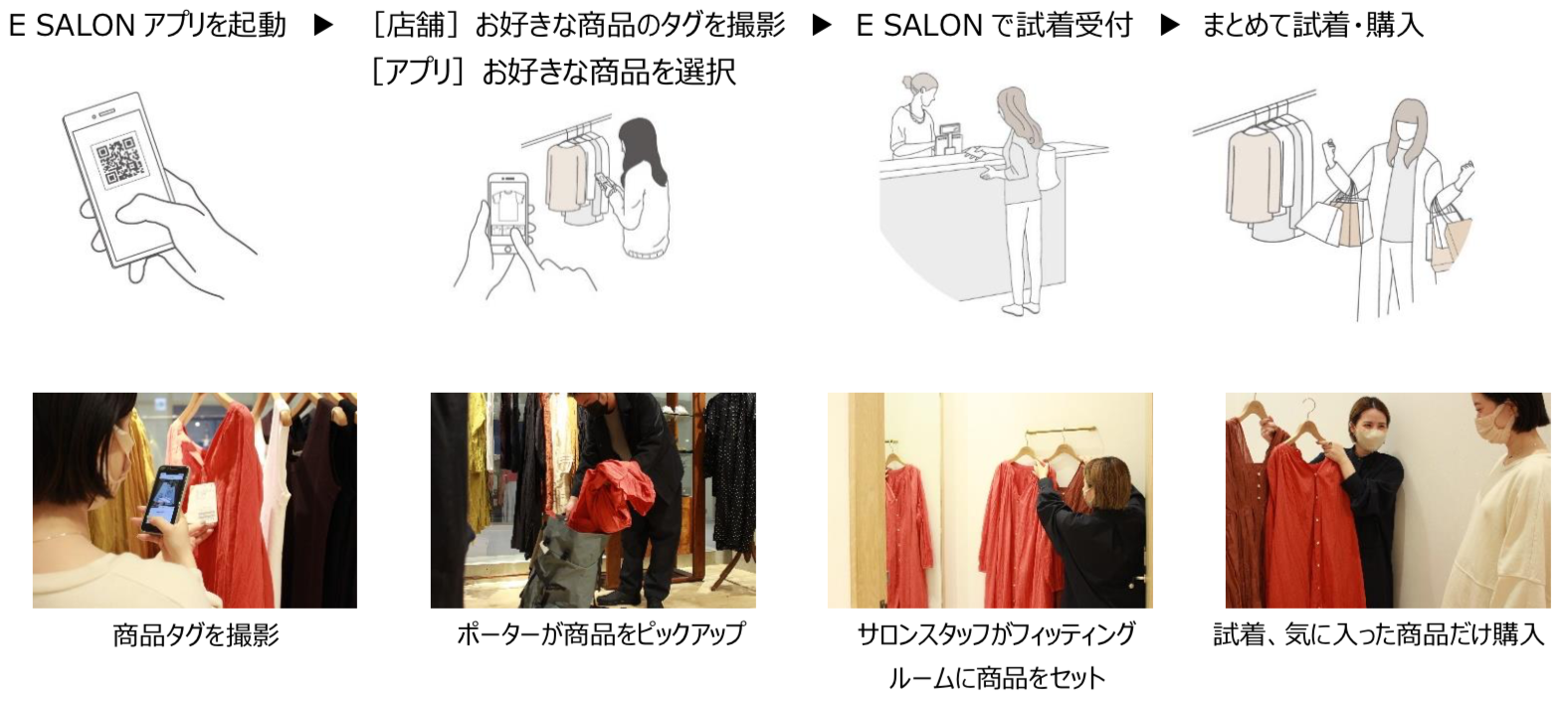 ECとリアルでの新しいお買い物体験で、人の目を気にすることなく、より自分らしい洋服選びができる「E SALON」にご期待ください。