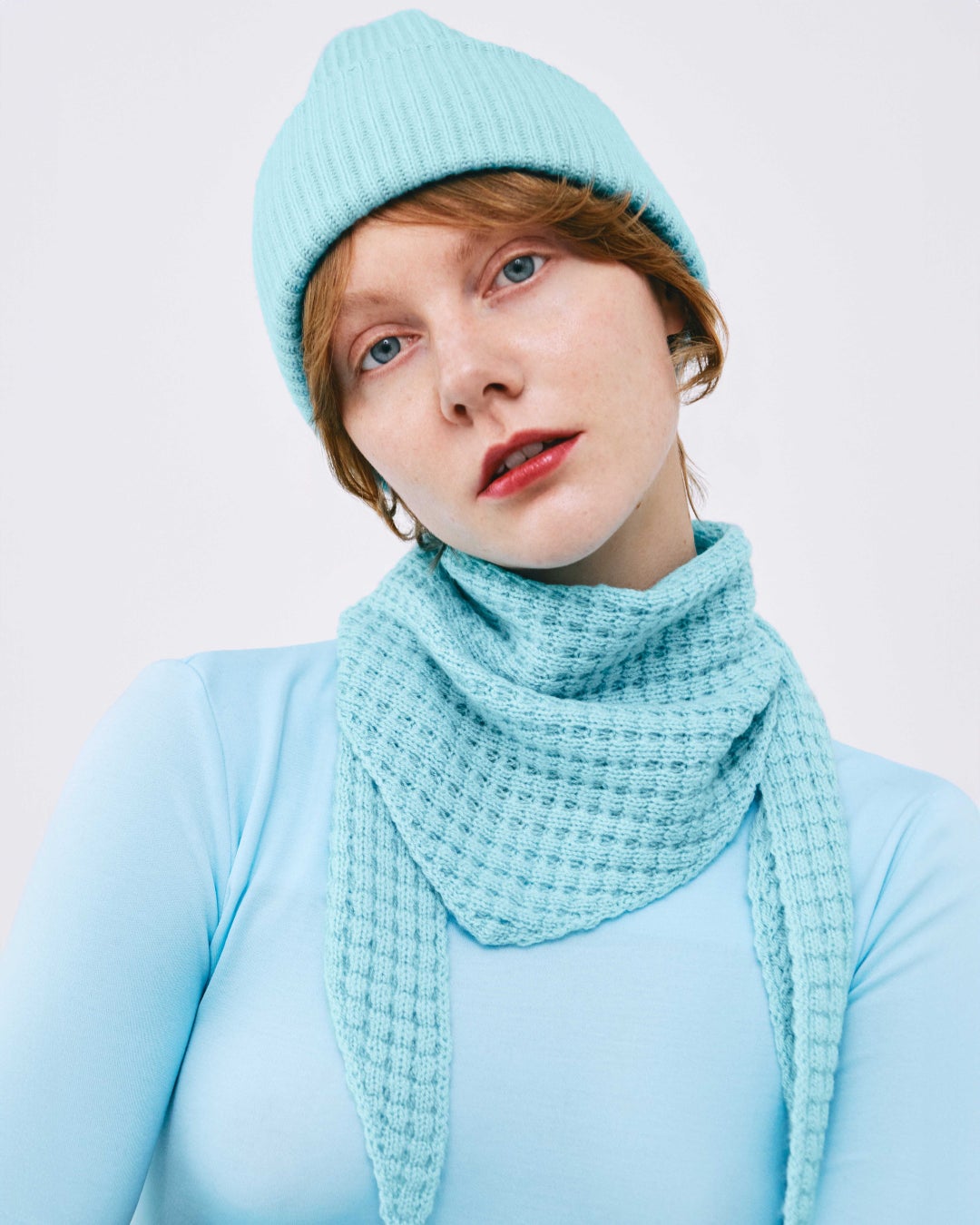ワッフル柄がアクセントになるトライアングル型のニットストール。 カシミヤに近い繊維の細さを持つ最高品質メリノウールとカシミヤをブレンドすることで、 ソフトな肌触りながら、ウールをベースにすることで立体的にワッフル柄が浮立ち、 ソリッドながらも奥行きを感じるデザインとなっています。 コンパクトながらも嵩高性があるため、しっかりと首元を温めてくれます。