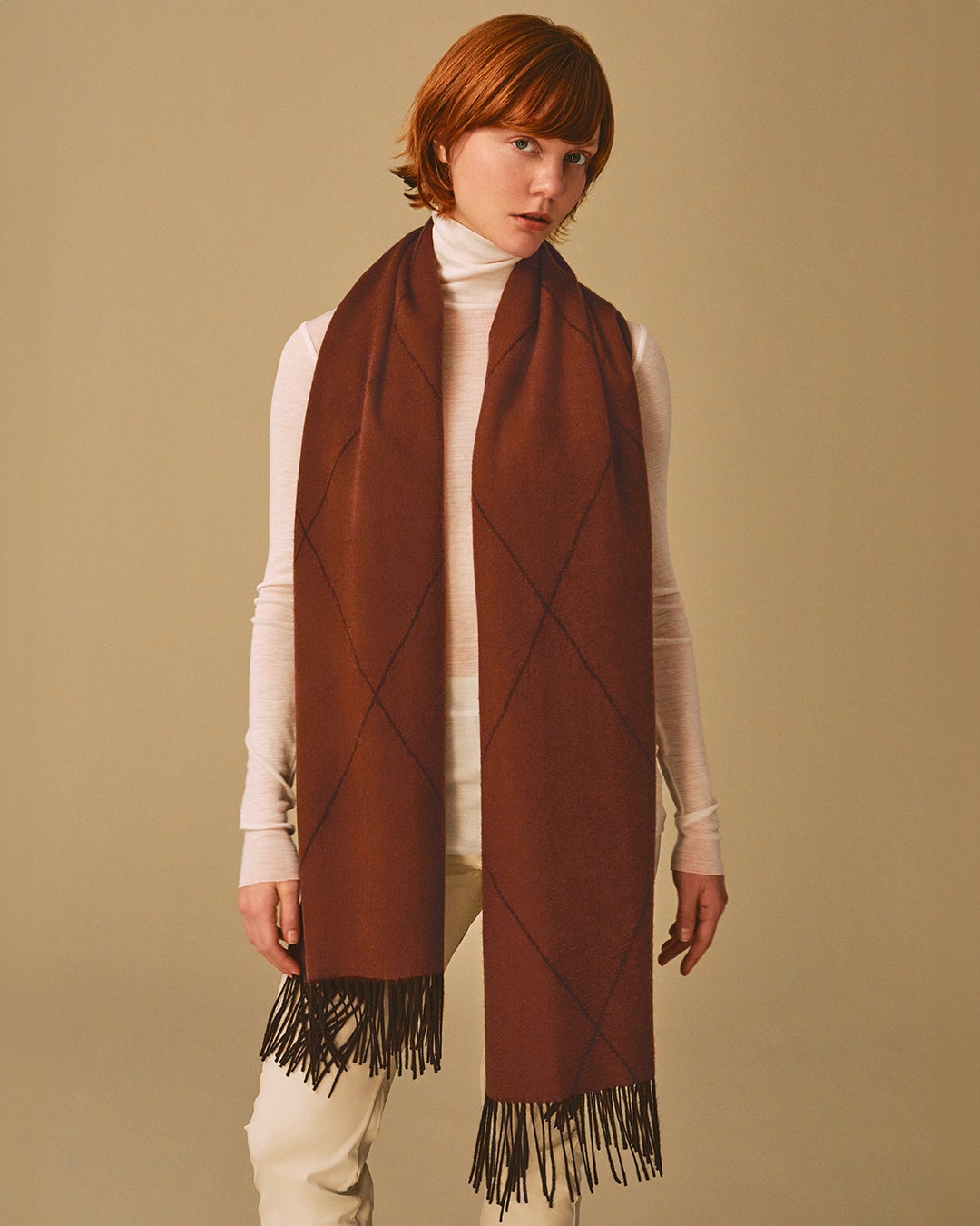 ダイヤパターンにすることで、優雅な首元を表現してくれるニットスカーフ。表裏で色が異なるバイカラーは、 アレンジを楽しんで頂けると共に奥行きあるスタイリングに。 織物とは違ったニットアイテムならではの膨らみ、柔らかさもポイントです。