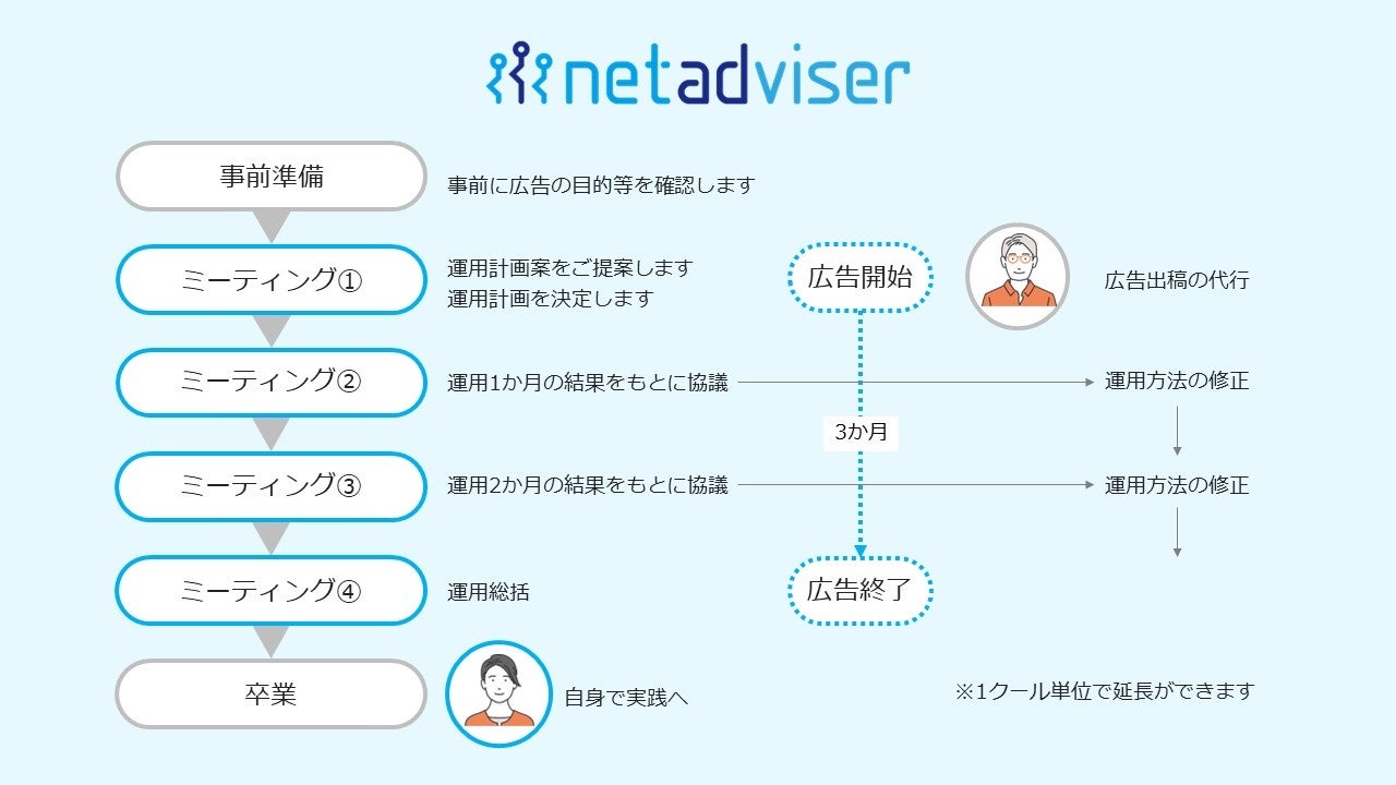 「ネットアドバイザー」のサポート期間は、1クール=3か月が基本となります。継続してサポートを受けたい場合は、1クール単位で延長も可能です。