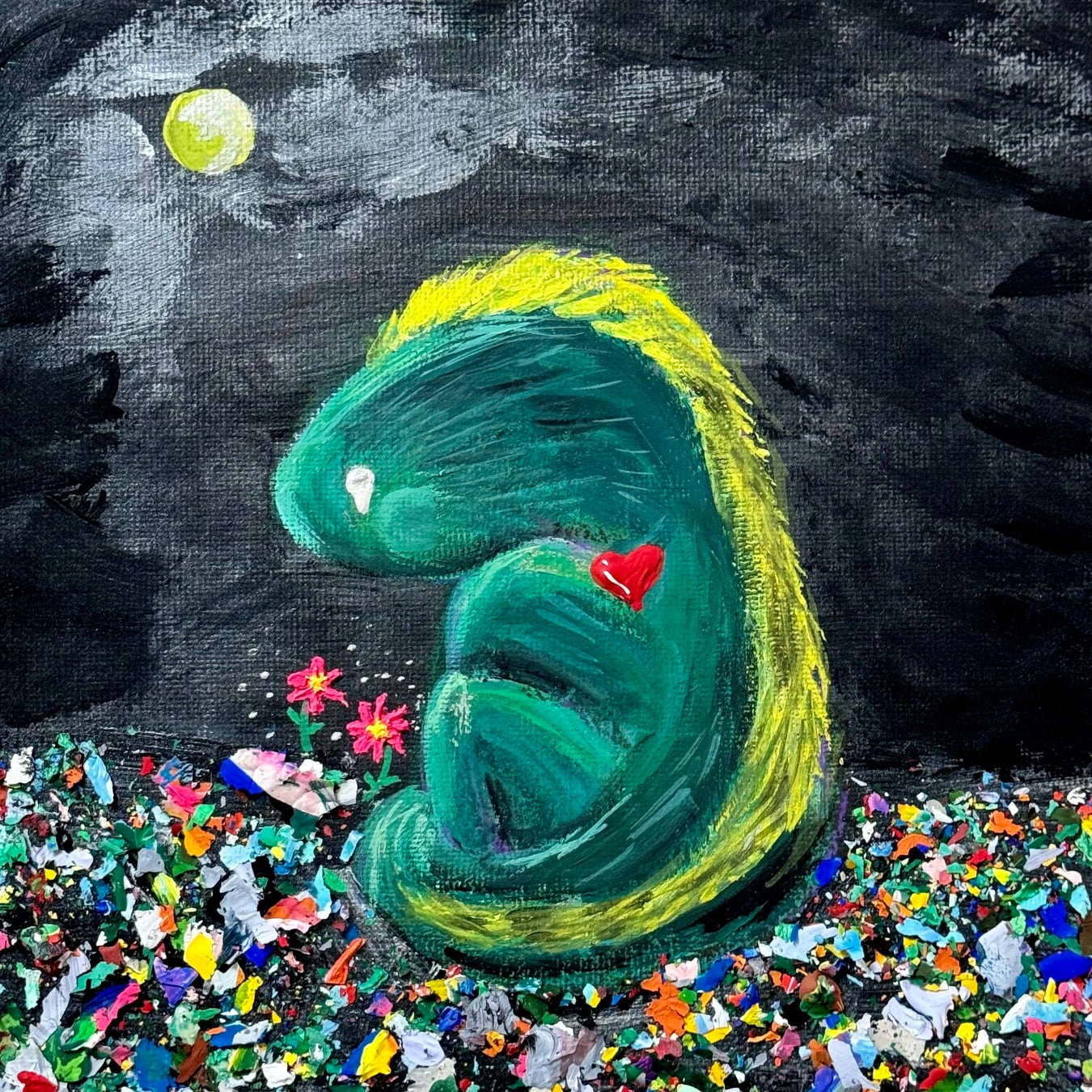 地面に広がるカラフルな破片は、何度も使われたパレットからこぼれ落ちた絵の具たちです。本来であれば洗い流され、捨てられてしまう破片をキャンバスに敷き詰めました。この社会にとって「必要」か「不必要」かを決めているのも人間ですが、不必要なものなんて何ひとつないのです。何かを不必要だと決めつけ、排除する社会は、いずれ他者への優しさすらも握りつぶしてしまうかもしれない。「異質で不要なもの」たちが集まる世界は、寂しくて哀しくて、あたたかい。そんなあなたの味方でいたくて、この作品を作りました。どうかあなたの暗闇が優しい場所になるように。