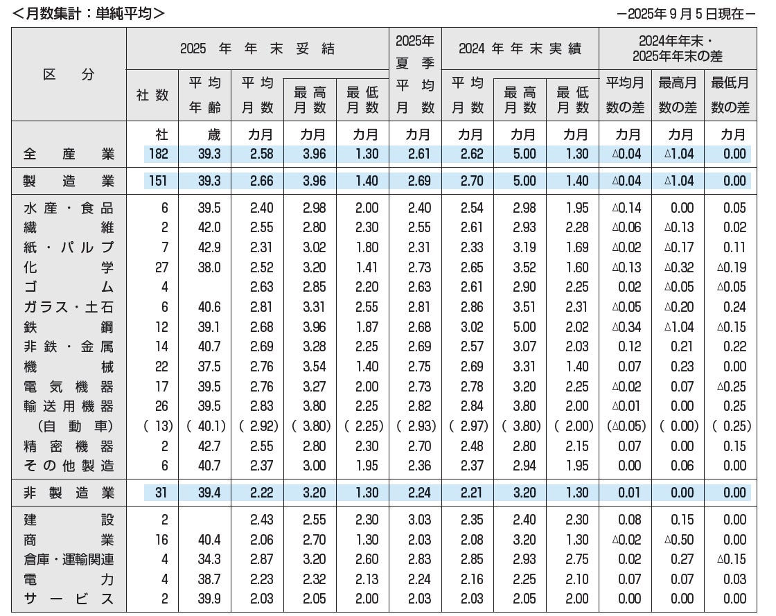全産業182社の平均で2.58カ月。同一企業で見た場合、前年同期(2.62カ月)を0.04カ月下回った。最高月数は3.96カ月と前年同期(5.00カ月)を下回り、最低月数は1.30カ月で前年同期と同水準である[図表4]。