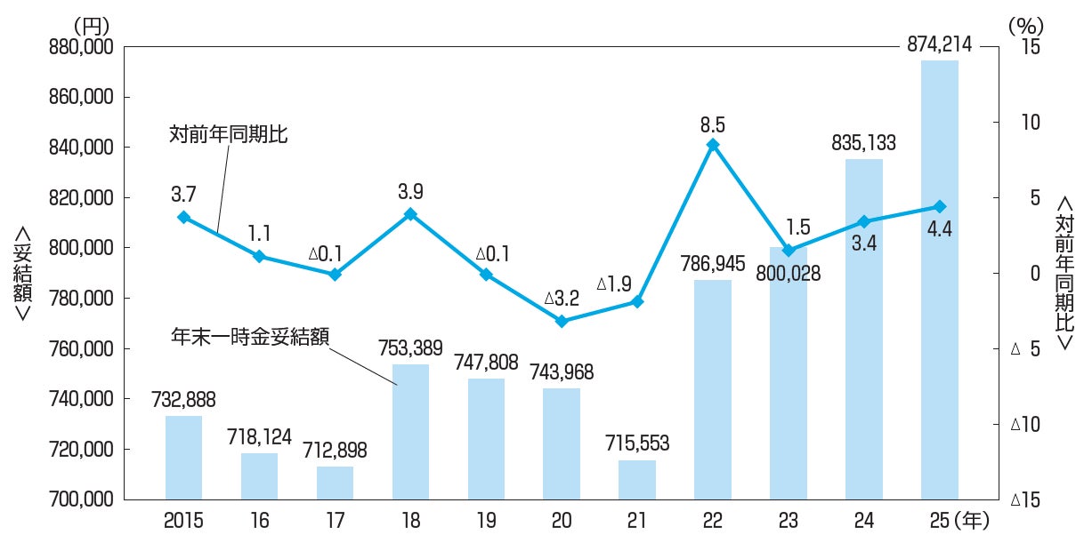 各年9月時点の集計で見た年末一時金妥結額は、コロナ禍の影響で2020年、2021年は対前年同期比でマイナスとなったが、2022年に8.5%増と大幅なプラスに転じ、以降4年連続の増加。2025年は直近10年で2番目に高い伸び率となった[図表2]。