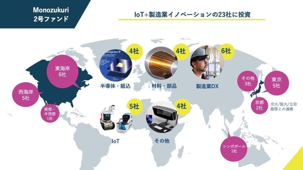 Monozukuri 2号ファンドでは、これまでMZVが投資・支援してきた「IoT領域」に加え、製造業を進化させる領域を「製造業イノベーション領域」と位置づけ、「製造業DX」の枠にとどまらず、「材料・部品」や「先端製造技術」「調達・サプライチェーン」などを投資対象としています。現在までに日本、アメリカ、シンガポールのスタートアップ23社に投資(追加投資を含む)を実施しています。