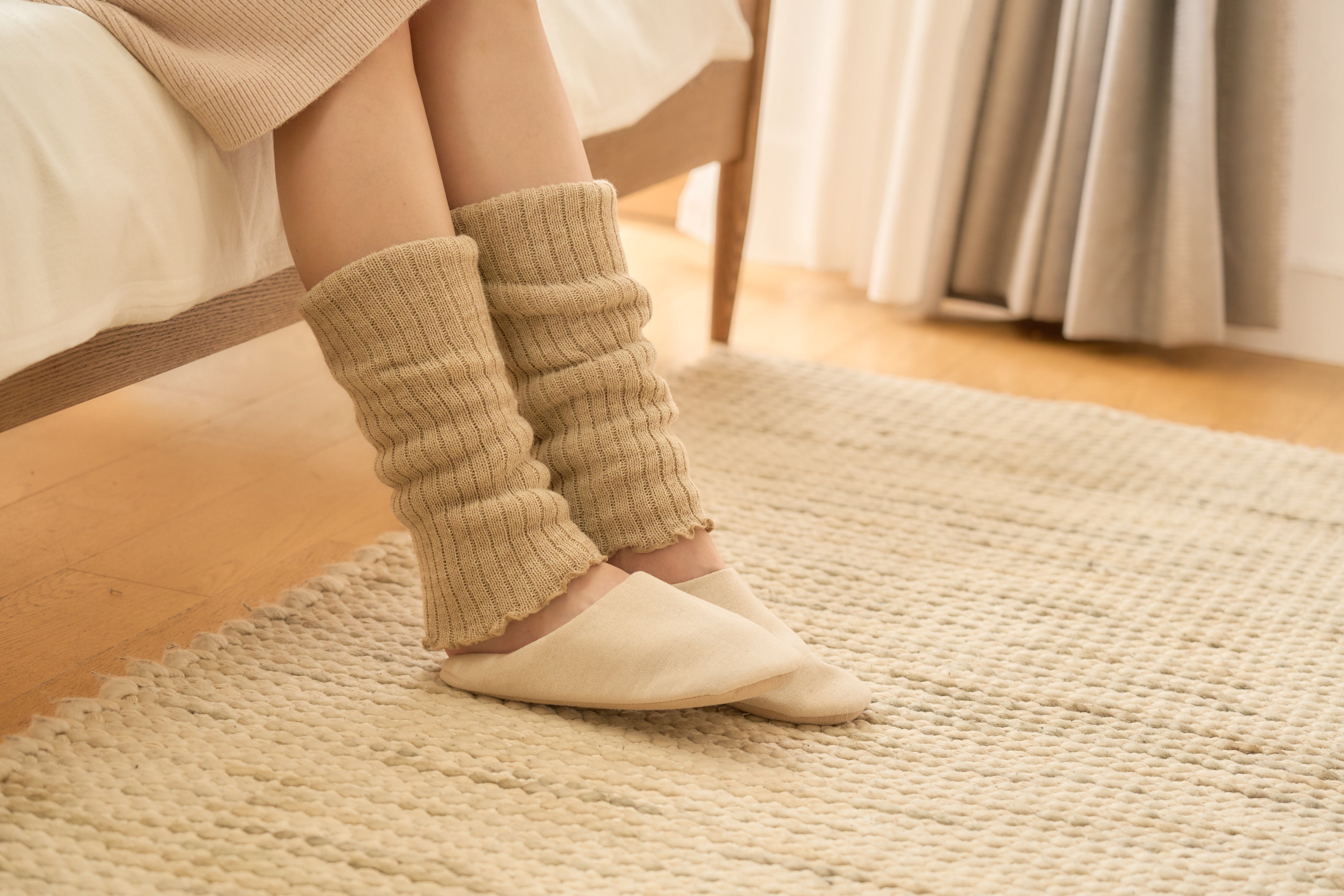 さらに2022年には、「締めつけない履き心地」をテーマにしたレッグウォーマーの開発に携わりました。きっかけは、営業メンバーと訪れた東京・八王子の洋品店で聞いた店主の言葉でした。「一日中座って過ごす高齢者は足がむくみやすく、ゴムや伸縮性のある糸が少しでも入っていると、それだけで締めつけを感じてしまう。ゴムを使わない靴下を作れないかと工場に相談しても、どこも“できない”と言われた」。
