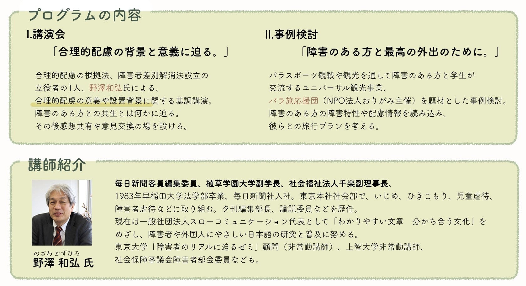 本研修会では、合理的配慮の根拠法「障害者差別解消法」の制定の礎となった『障害のある人もない人も共に暮らしやすい千葉県づくり条例』の成立に尽力された、植草学園大学副学長、野澤和弘氏を講師にお招きしご講演いただきます。その後、「障害のある方を配慮した過ごし方や企画づくり」を通して合理的配慮への理解を深めるワークショップを行います。