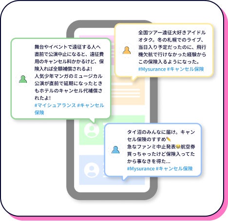 この度、Oshicocoに多大なるご協力をいただき、「推し活キャンセル保険」の専用サイトを開設できたことを大変嬉しく思っています。Mysuranceのキャンセル保険は、お客さまから「保険があるから安心して(早期の)旅行予約ができた」「保険金を受け取ったので、また再出発(旅行予約)が出来る」といった嬉しい声を頂くことが多く、コロナ収束後も続く旅行のキャンセル不安を解消する商品として、引き続き多くのユーザーの皆さまから高い支持をいただいています。