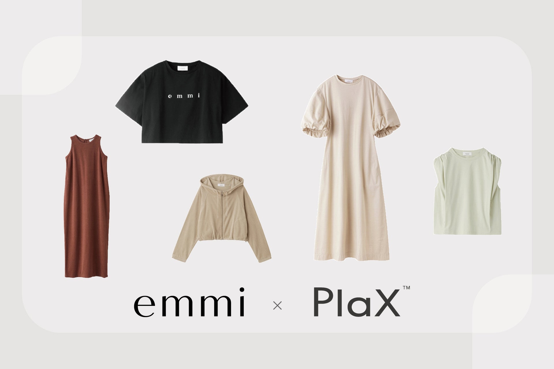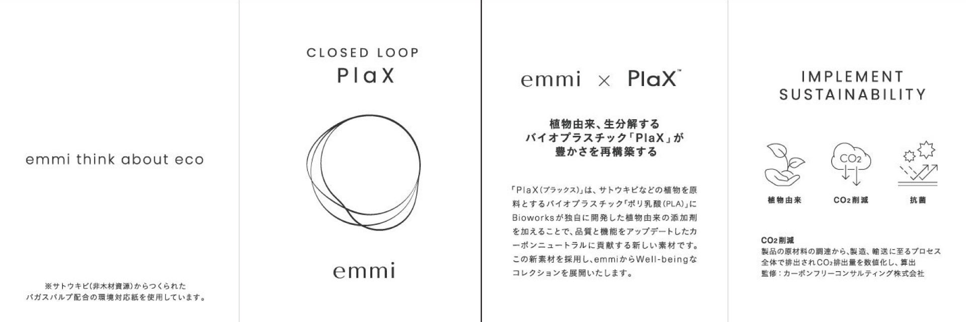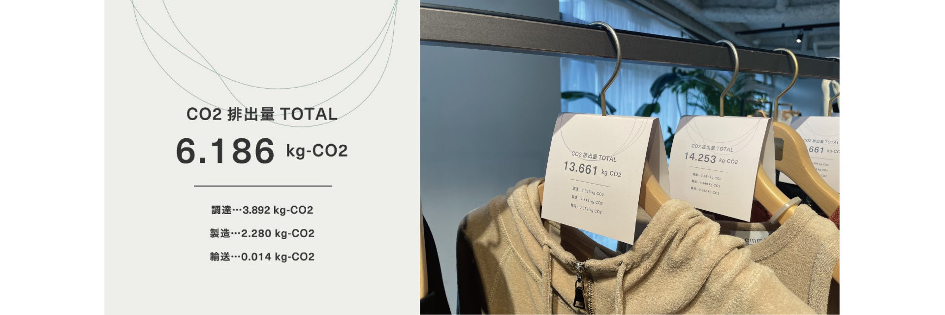 5月下旬より順次販売される製品には、emmi×PlaX™限定のオリジナルタグに素材の特性を記載し、特別展示を行う3店舗の製品ハンガーには一製品ごとにCO2排出量を表示いたします。