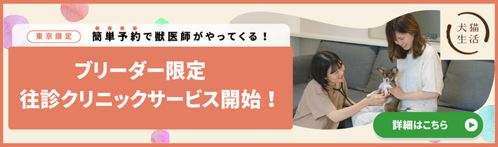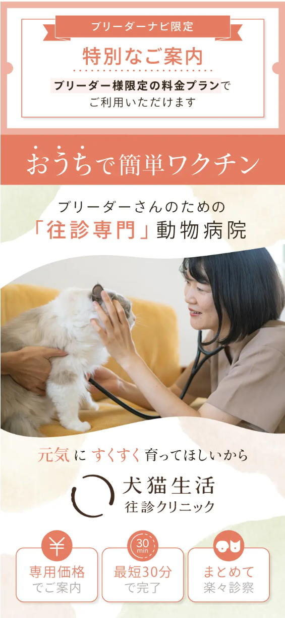 「ブリーダーナビ/子猫ブリーダーナビ専用 犬猫生活 往診クリニック」は、ブリーダーナビ・子猫ブリーダーナビ登録ブリーダー向けの「犬猫生活 往診クリニック」です。