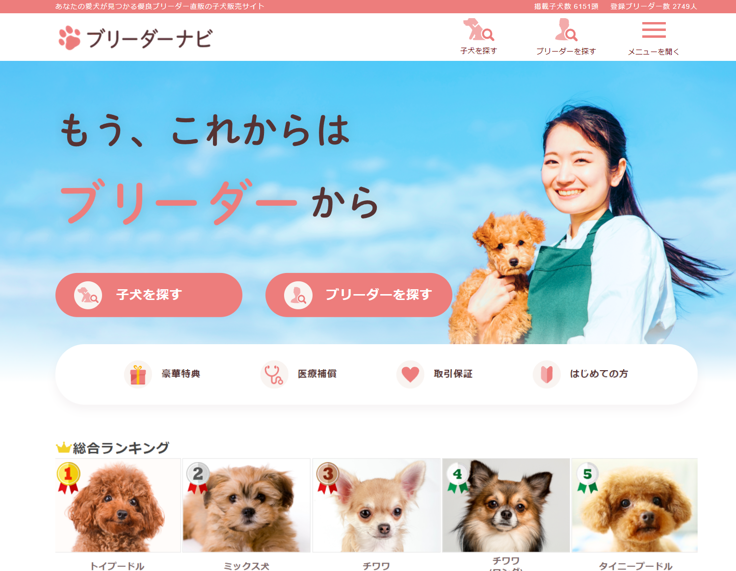 登録ブリーダーは独自の基準をクリアした優良ブリーダーのみなので、運命の子犬・子猫を安心してお探しいただけます。子犬の情報は常時6,000頭以上、子猫の情報は常時2,400頭以上掲載(2024.1.1時点)。ブリーダー直販の子犬・子猫販売サイトとしては業界トップレベルの掲載数となっています。