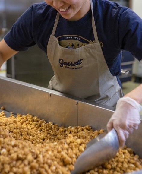 ギャレット家のキッチンで行われたキャラメルポップコーンのレシピ品評会から生まれた「キャラメルクリスプ™」は、ファミリーレシピと手づくりにこだわり、誕生から73年経った今でもお店のキッチンで毎日、特製の銅窯を使用してお砂糖からとろとろに煮詰めて作っています。他にはないカリカリとした食感とキャラメルの深い味わいが自慢の逸品です。
