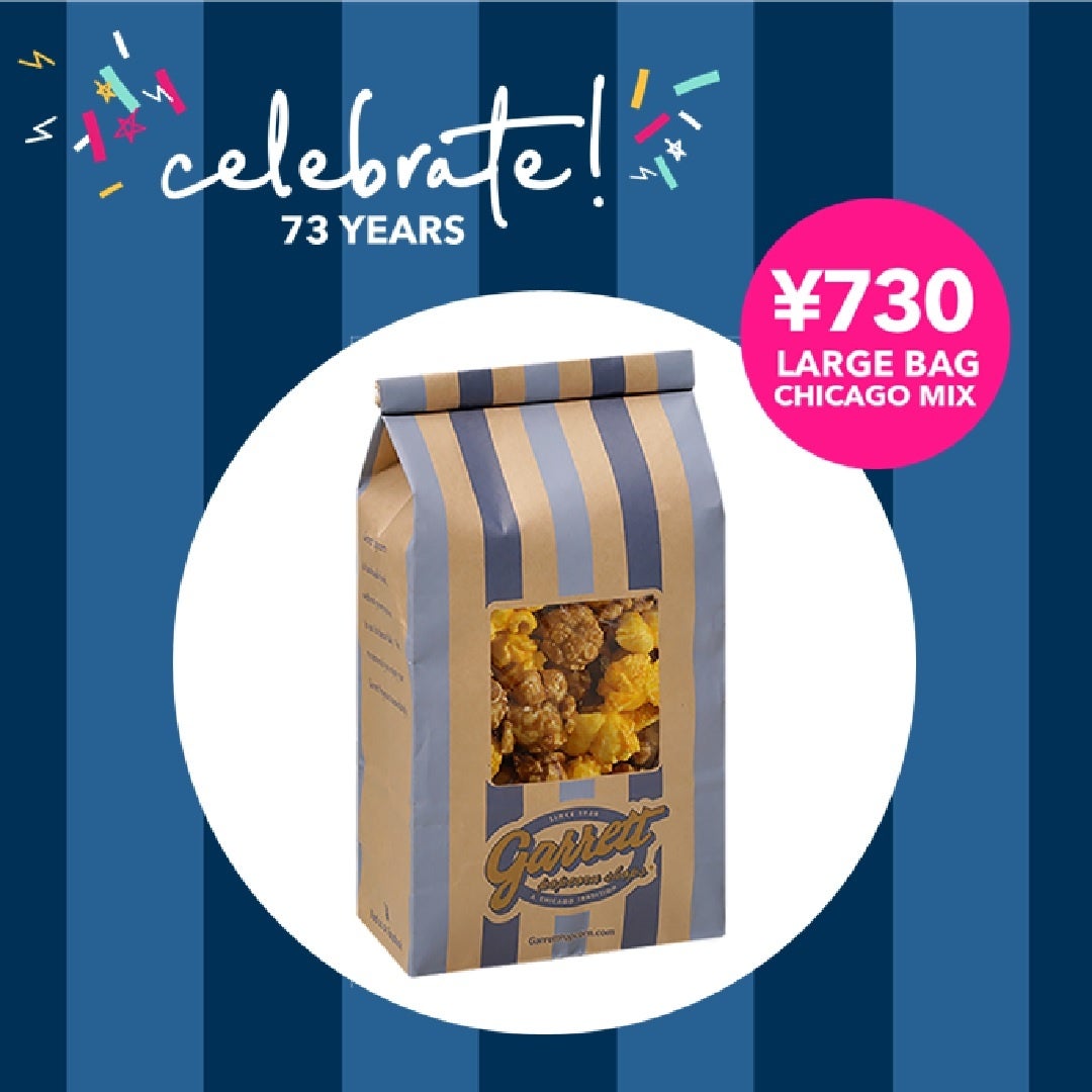 ギャレット ポップコーン ショップス®73YEAR ANNIVERSARY企画の第1弾として、9月18日(日)限定で、シカゴ ミックス® Lサイズを730円で販売いたします。