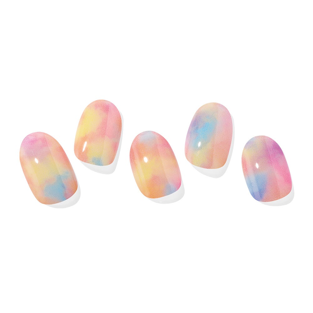 五色の光が輝くパステルマーブルネイル。ピンク、ブルー、イエローなど、パステル系の色が混ざり合い、絞り染めのようなニュアンスを感じさせるマーブルデザインです。ファンタジックでキュートな魅力がいっぱい。色をたくさん使っていても主張しすぎず、指先になじむので、幅広いファッションやシーンで活躍します。