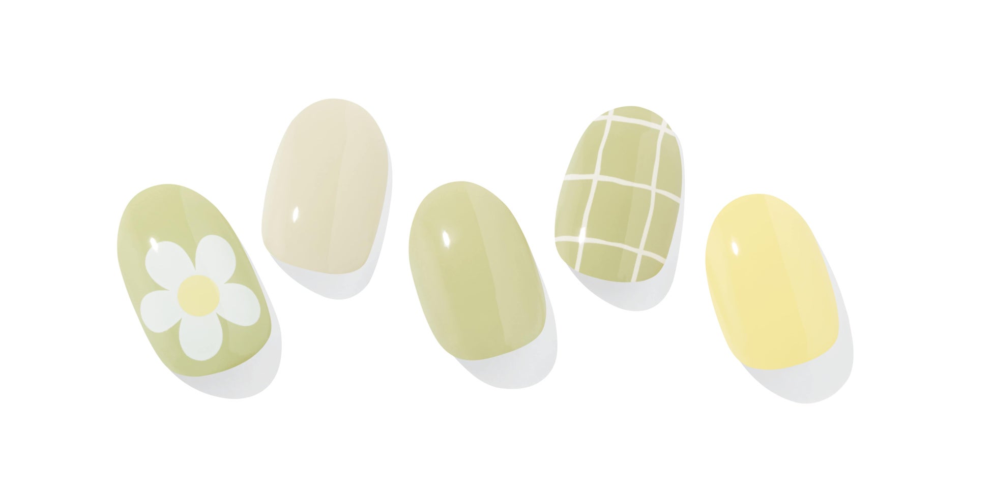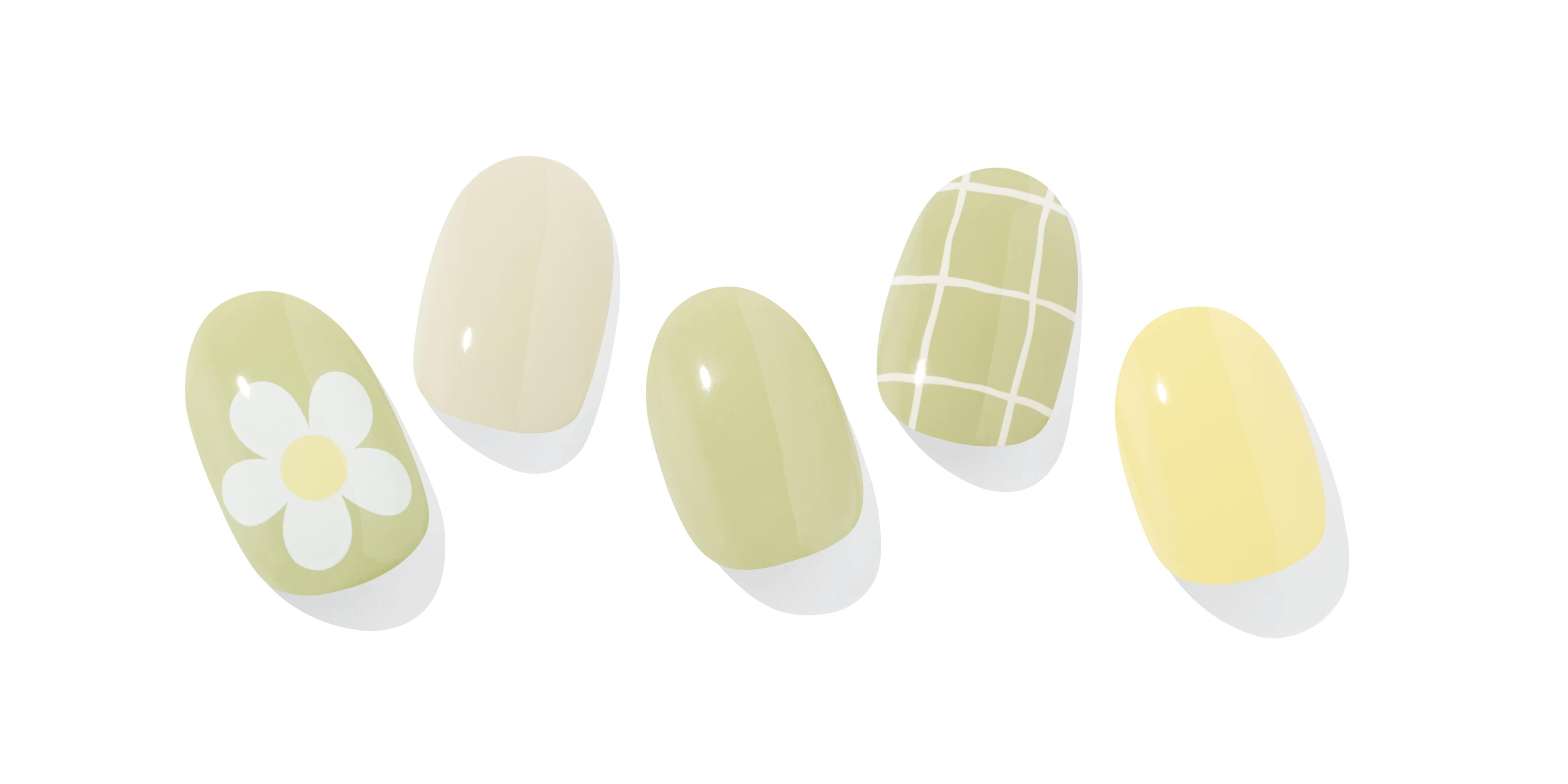 春にときめく!オリーブベースのデイジーネイル。濃淡のオリーブ色をベースに、手描きラインやデイジーの花が楽しげなアクセントをつくります。指を動かすたびにデイジーの花がゆれ、ワクワクした気持ちを呼び起こします。
