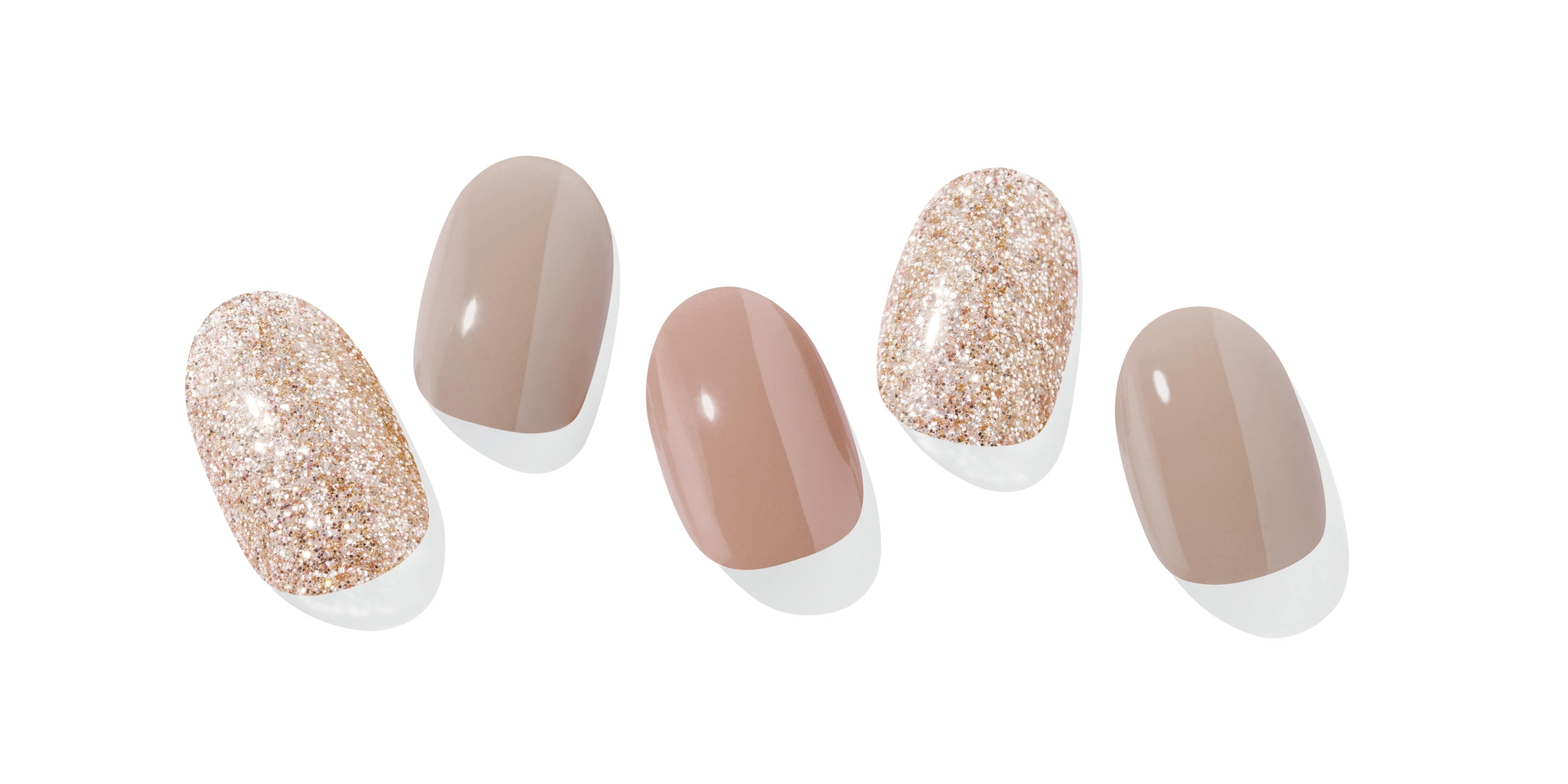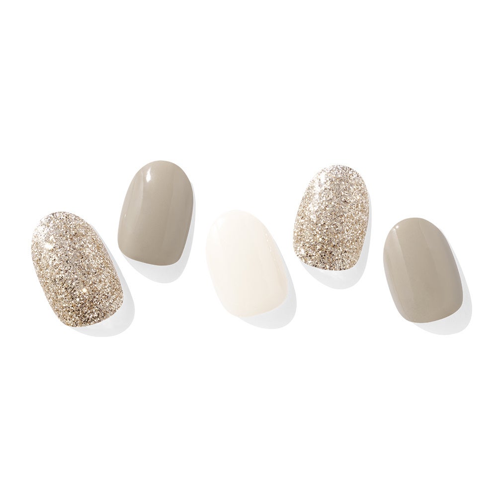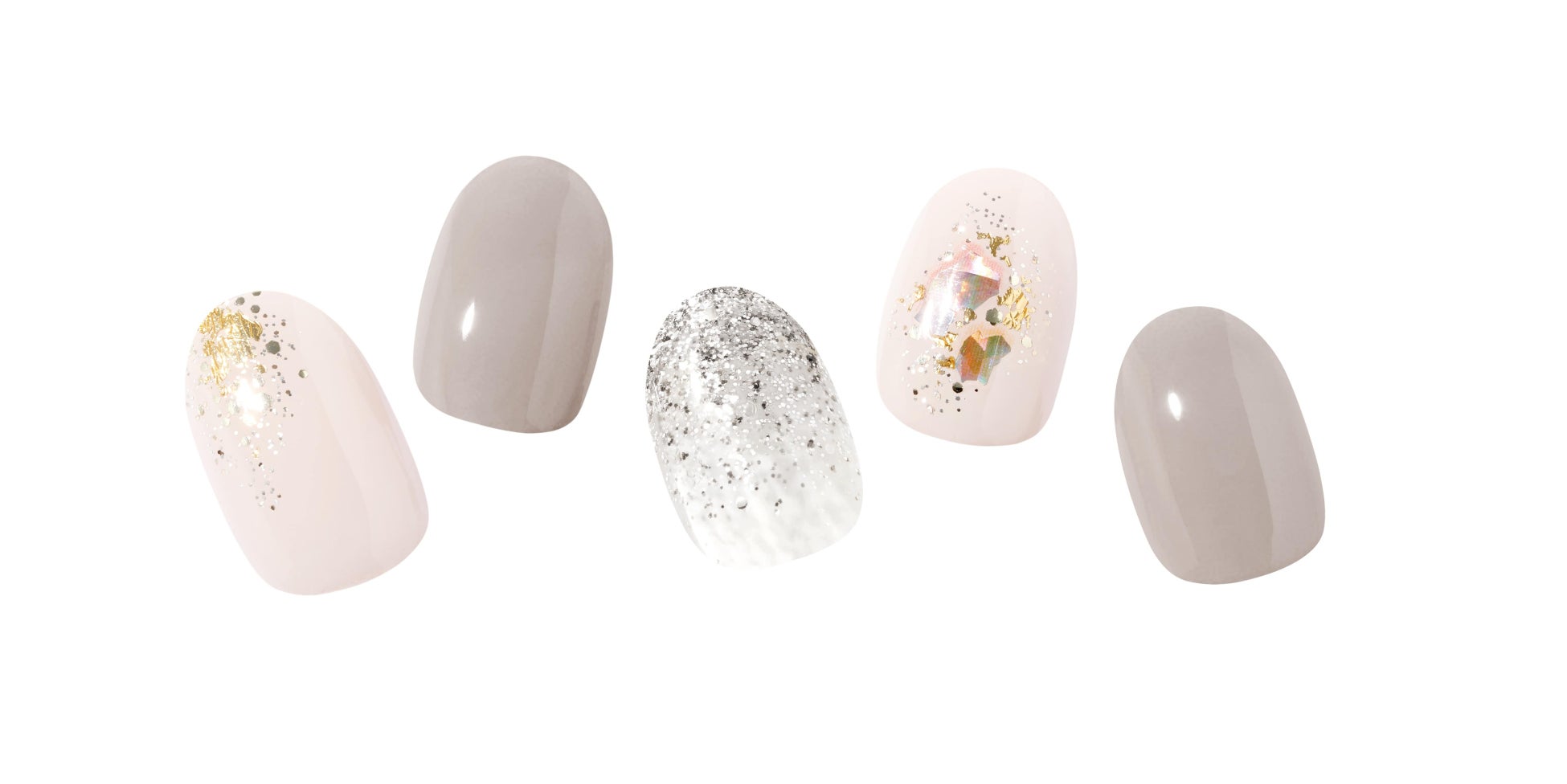 【日本限定デザイン】金色の輝きが降り注ぐミルキーネイル。グレイッシュなベージュやミルキーカラーなど、肌なじみのよいやわらかなトーンと、グリッターや金色の箔、ホログラムなどの輝きでコントラストをつけたネイルデザイン。