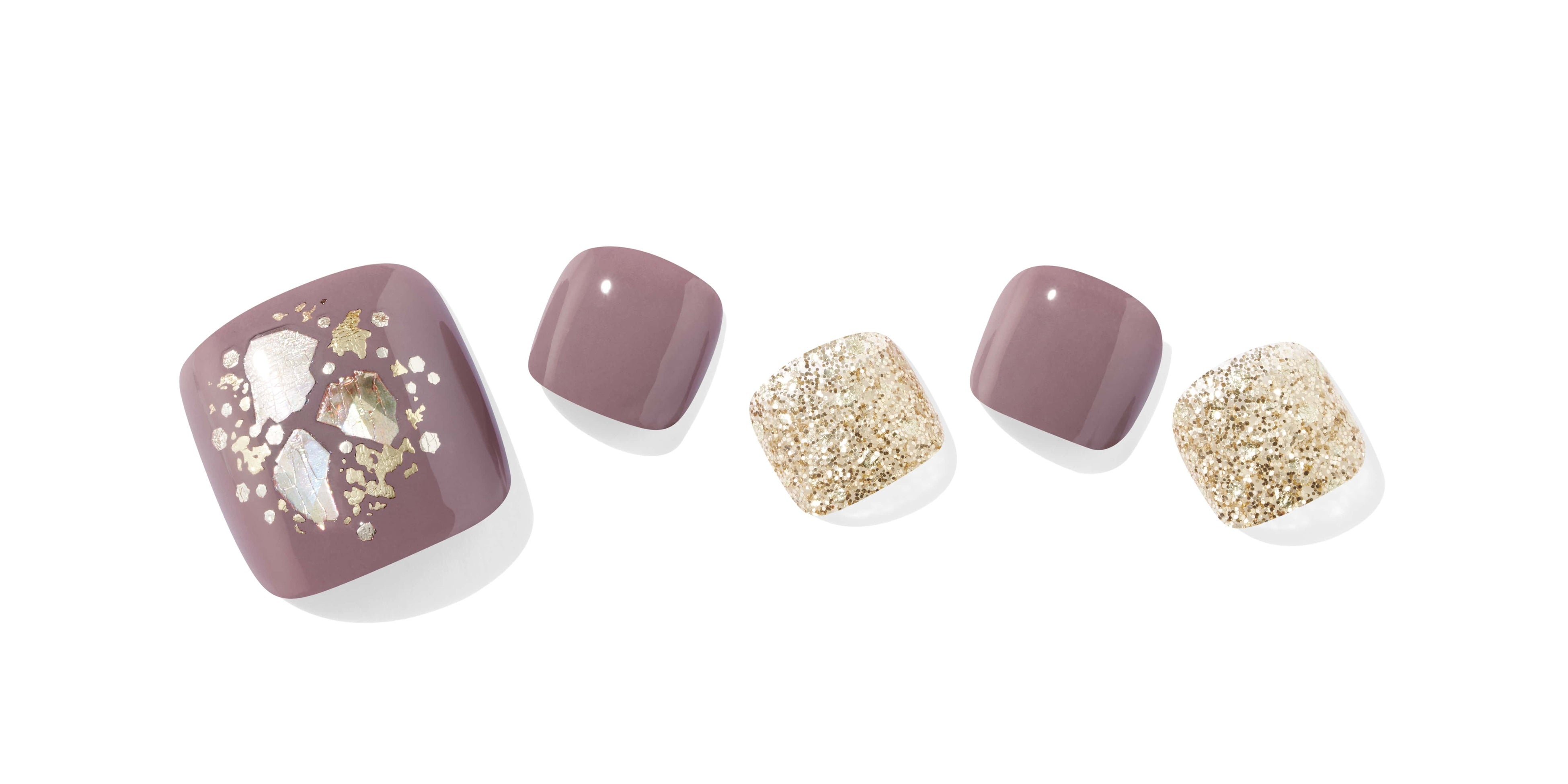 【日本限定デザイン】可憐さが花開くシャイニーペディ。肌になじみのよいベージュピンク×きらびやかなゴールドグリッターのペディキュアデザインは、上品さと華やかさのバランスが絶妙。