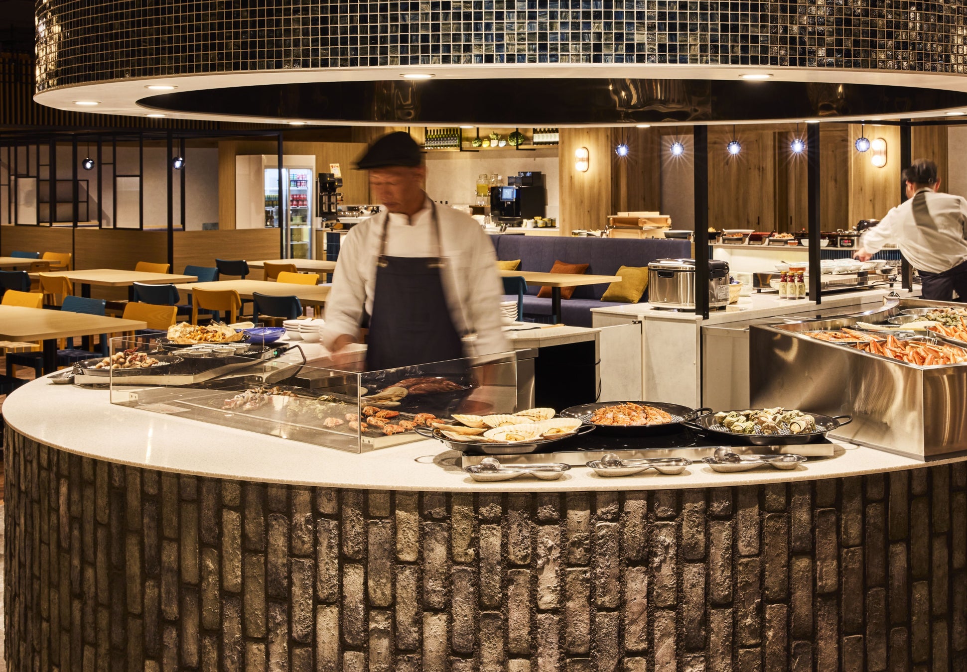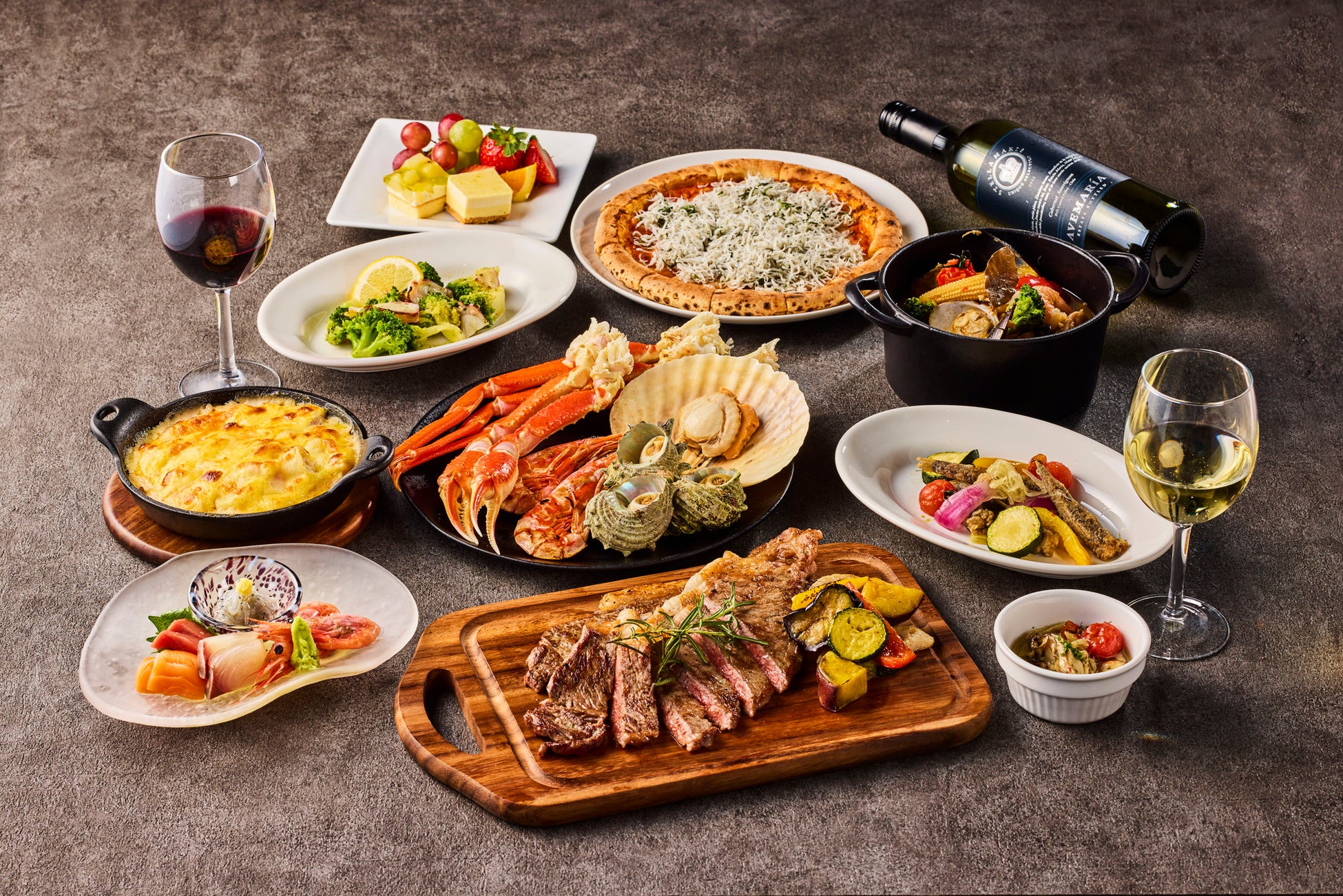 お客様の自由なスタイルで召し上がりいただくバイキングコーナーには、和洋にこだわらず、旬の山海バイキング料理や地産素材を中心としたいばらきの味を再現、地域に根付いた地場料理など海の幸や山の幸の競演です。また、フリードリンクコーナーでは、ソフトドリンクの他、ご夕食時には、各種アルコール飲料もご用意しています。