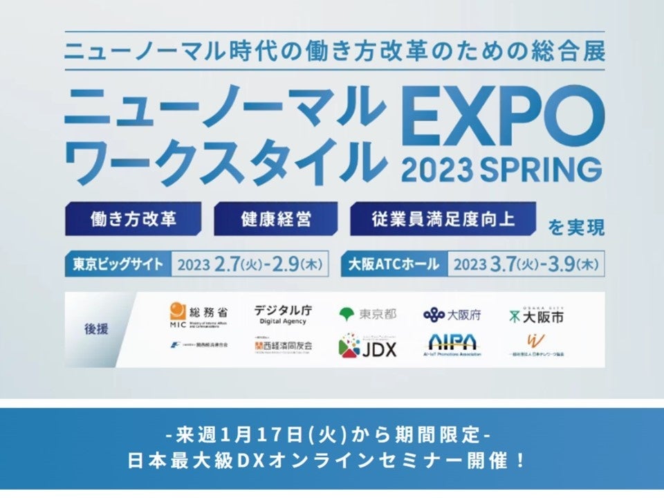 2月東京/3月大阪で開催をする「第3回ニューノーマルワークスタイルEXPO」では、働く場改革、ウェルビーイング、従業員満足度ソリューション、バックオフィスDXなどの「ポストコロナ時代の新しいき方を実現するソリューション」の最前線をリアル展示会とオンライン両方で知ることができます。