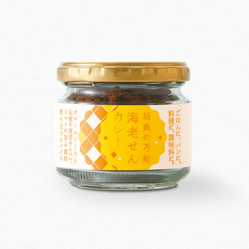 〈坂角の万能 海老せんカレー〉は、瓶詰めのドライカレー状の惣菜で、オマール海老とトマトの濃厚な旨みと香り立つスパイスに、海老せんべい〈ゆかり〉の香ばしさが加わり、そのままご飯にのせても、また、ひと手間加えることで、パンやパスタなど幅広いアレンジでお楽しみいただけます。