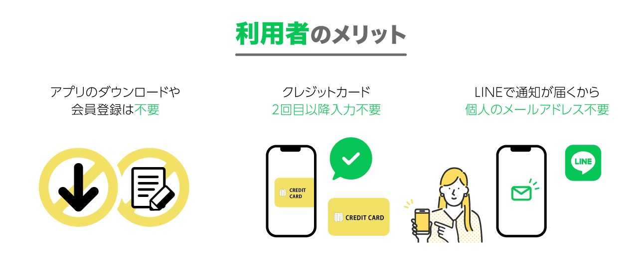「アプリの追加ダウンロードや煩雑な会員登録不要」等の特長で“快適なサービス体験”をユーザーに提供でき、企業はLINEアカウントに紐づいたユーザーデータを取得*し、自社のサービスの改善や「LINE公式アカウント」「LINE広告」等を通じたマーケティング施策に活用いただけます。