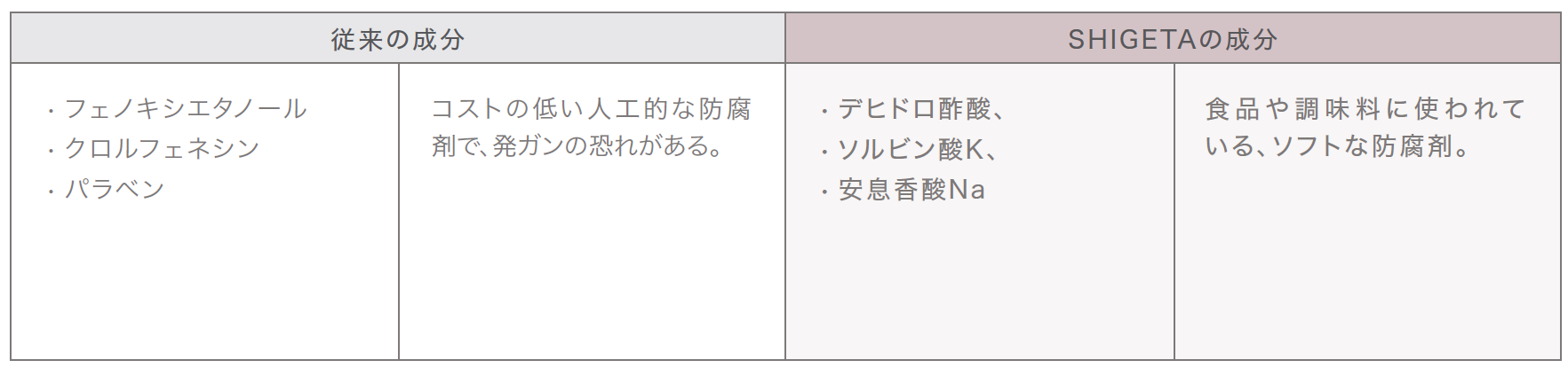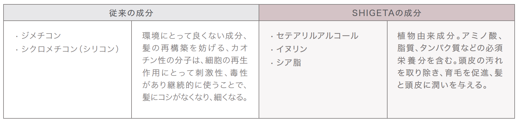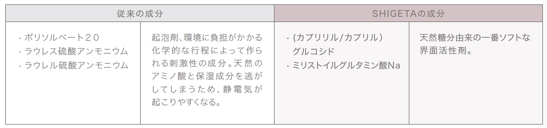 SHIGETAのヘアケアシリーズは、泡立ちをよくするため、界面活性剤の“ブースター”を配合しています。“ブースター”を配合していることで、大量の界面活性剤を加えることなく、豊かな泡立ちが実現しています。界面活性剤の使用量を抑えながらも、泡立ちが良く、髪や頭皮が乾燥しにくいのが特徴です。