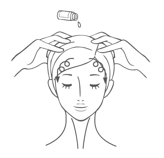 1. シャンプー後またはタオルドライ後にミッドナイトラスターを5滴頭皮につけ、髪の生え際に沿ってこめかみに向かい円を描きながら指3本でプッシュ。
