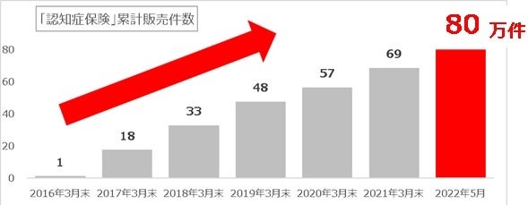 こうした社会的課題に取り組むため、当社では「ひまわり認知症予防保険」を始めとする認知症保険のご提供を続け、2022年5月には、これまで販売した認知症関連商品の販売件数が80万件を超えるなど、当社の取組みが多くのお客様のご支持につながったものと考えます。