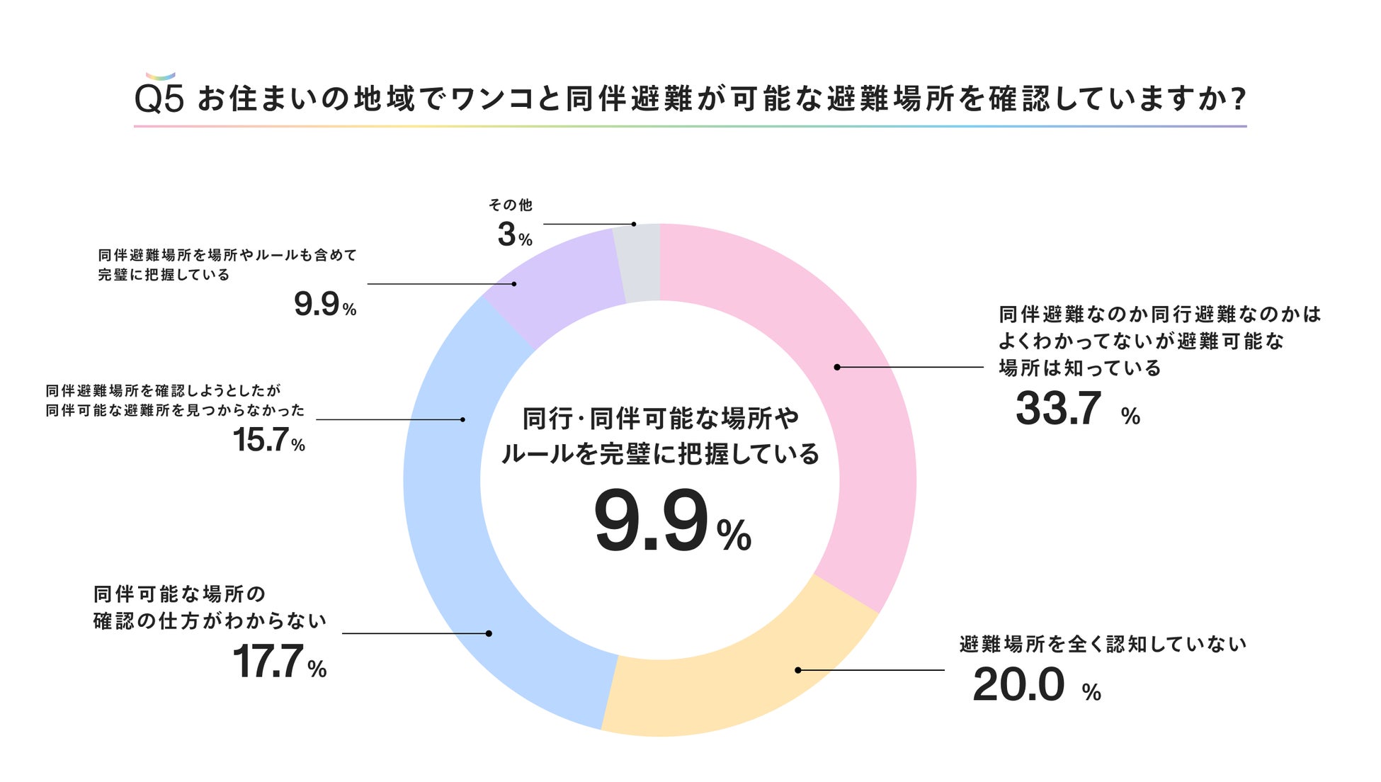 「同伴避難なのか同行避難なのかはよくわかってないが避難可能な場所は知っている」との回答がトップで33.7%、次いで「避難場所を全く認知していない」20%となり、同伴可能な避難場所を場所やルールを完璧に把握している」と回答したのは9.9%に留まりました。