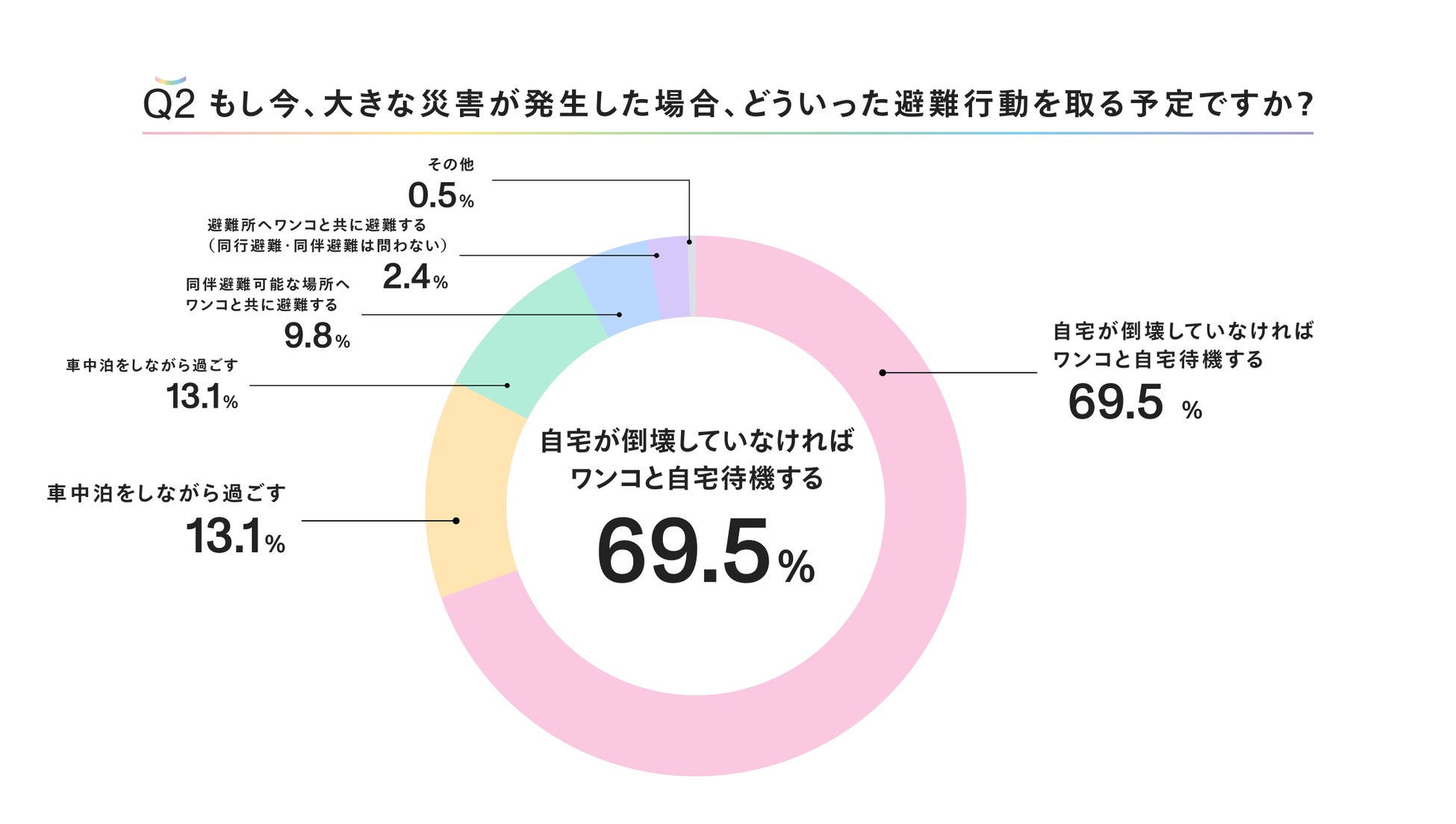 「同伴避難可能な場所への避難」や「同行避難・同伴避難問わず避難所への避難」を合わせると9.8%に留まり、69.5%が「自宅が崩壊していなければワンコと自宅待機する」と回答し、「車中泊をしながら過ごす(13.1%)」「テントなどキャンプ用品を活用して過ごす(4.7%)」と合わせると、85%以上が避難所以外の場所を想定していることがわかります。