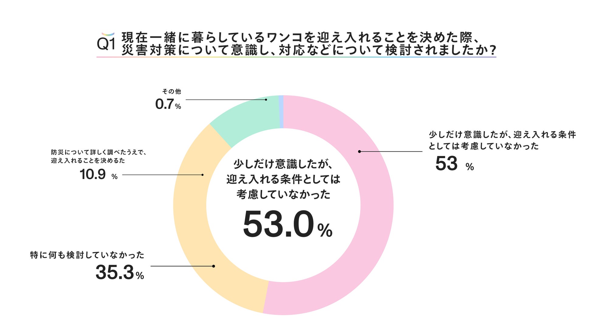 53%が「少しだけ意識したが、迎え入れる条件としては考慮していなかった」と回答、次いで、「特に何も検討していなかっった」が35.3%、「防災について詳しく調べた上で迎え入れることを決めた」と回答したのは10.9%に留まりました。しかしながら、「その他」と回答した方のフリーコメントでは、「当時は気にしていなかったが、一緒に暮らす中考え始めた」「迎える時は意識してなかったが迎えたあと犬用に防災バックを用意した」などの回答から、暮らし始めてから徐々に意識が高まっていることが考えられます。