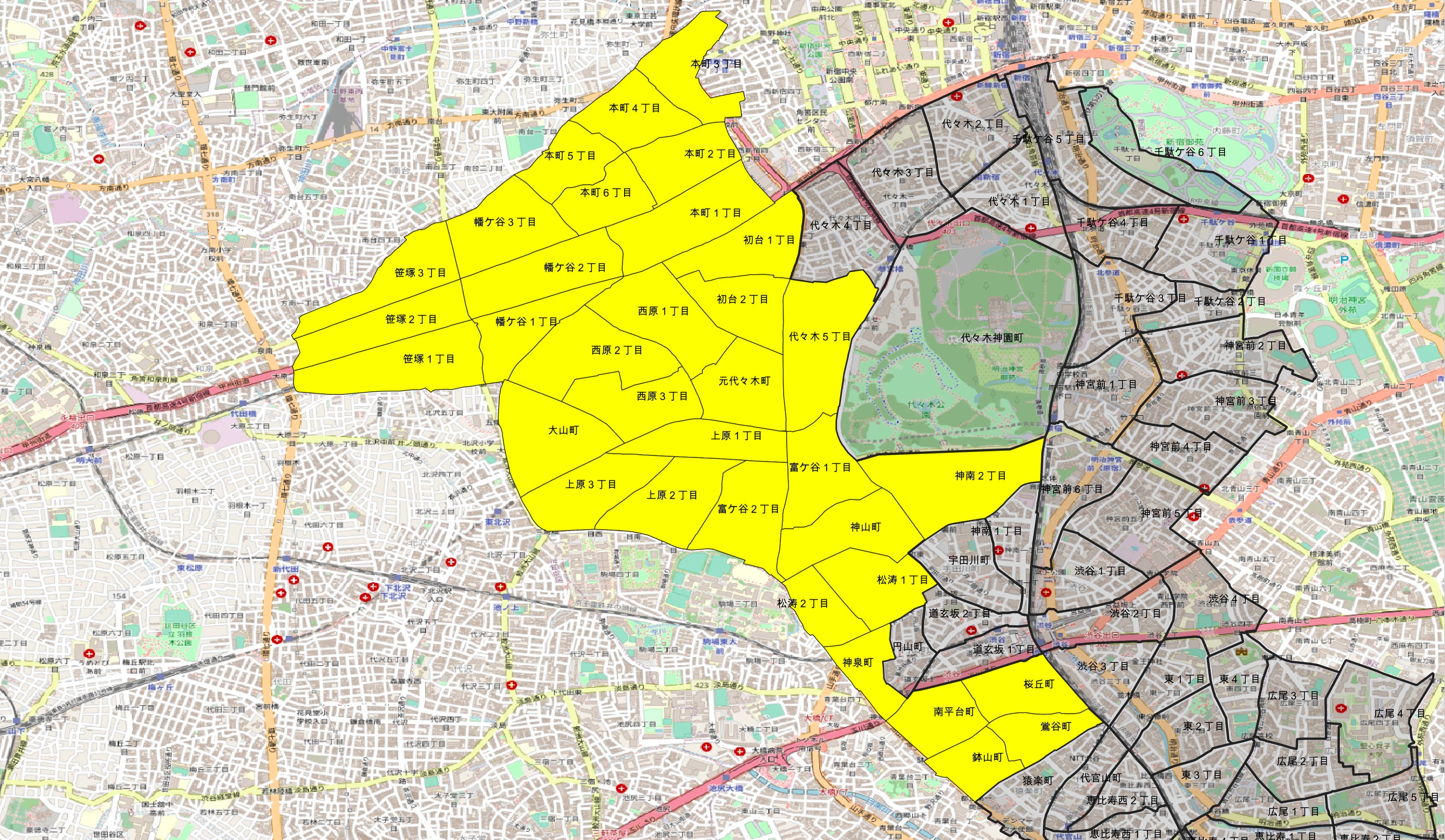 o本町1〜6丁目、幡ヶ谷1〜3丁目、笹塚1〜3丁目、西原1〜3丁目、初台1〜2丁目、元代々木町、代々木5丁目、大山町、上原1〜3丁目、富ヶ谷1〜2丁目、神山町、神南2丁目、松濤1〜2丁目、神泉町、南平台町、桜丘町、鉢山町、鶯谷町