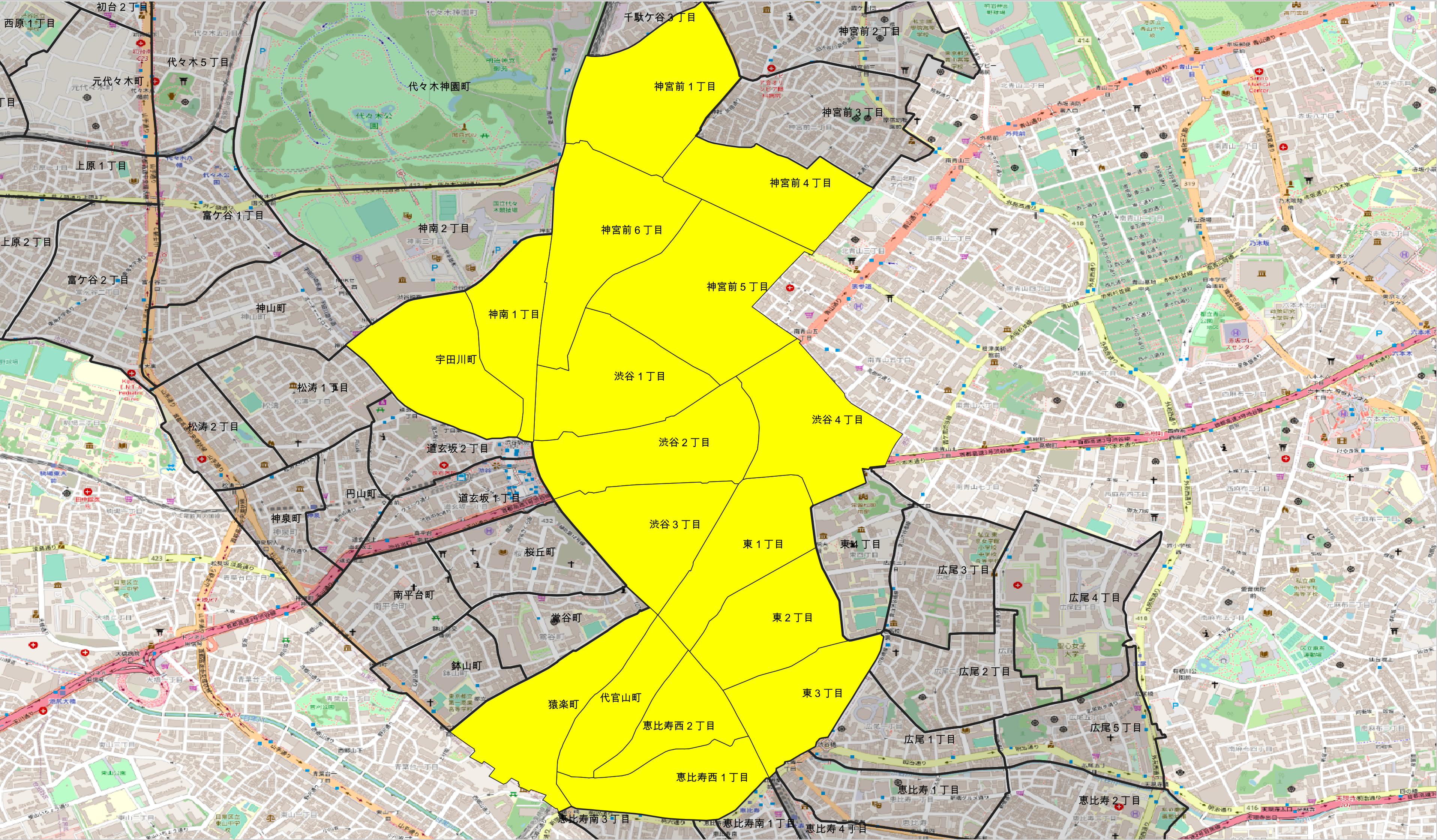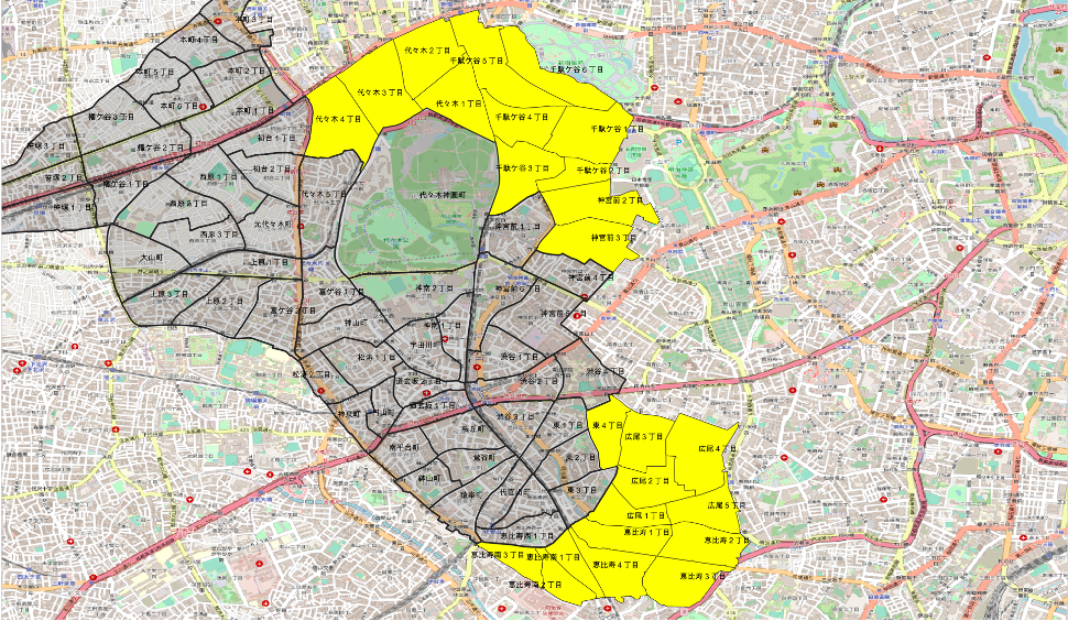 o代々木1〜4丁目、千駄ヶ谷1〜5丁目、神宮前2〜3丁目、広尾1〜5丁目、東4丁目、恵比寿1〜4丁目、恵比寿南1〜3丁目