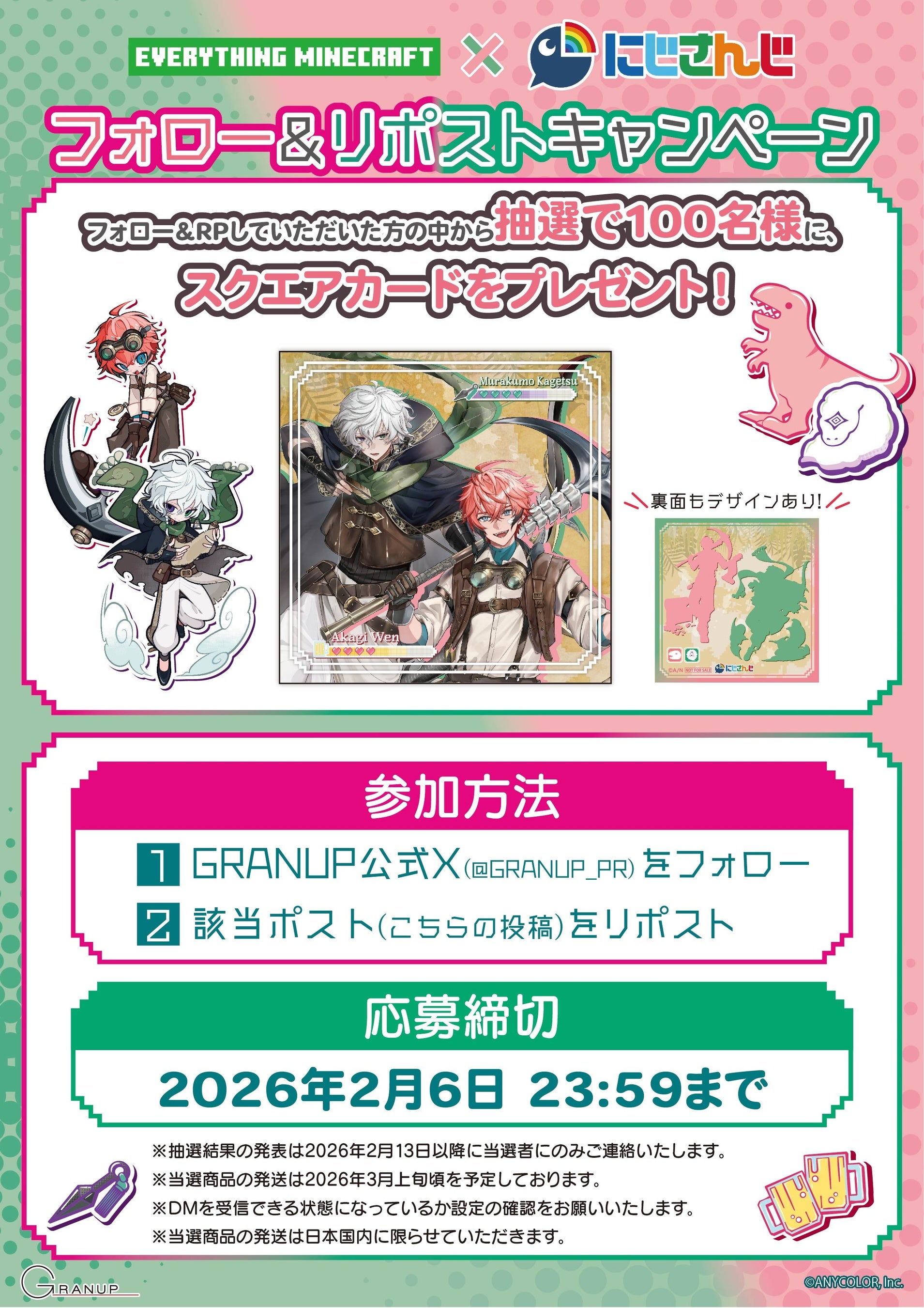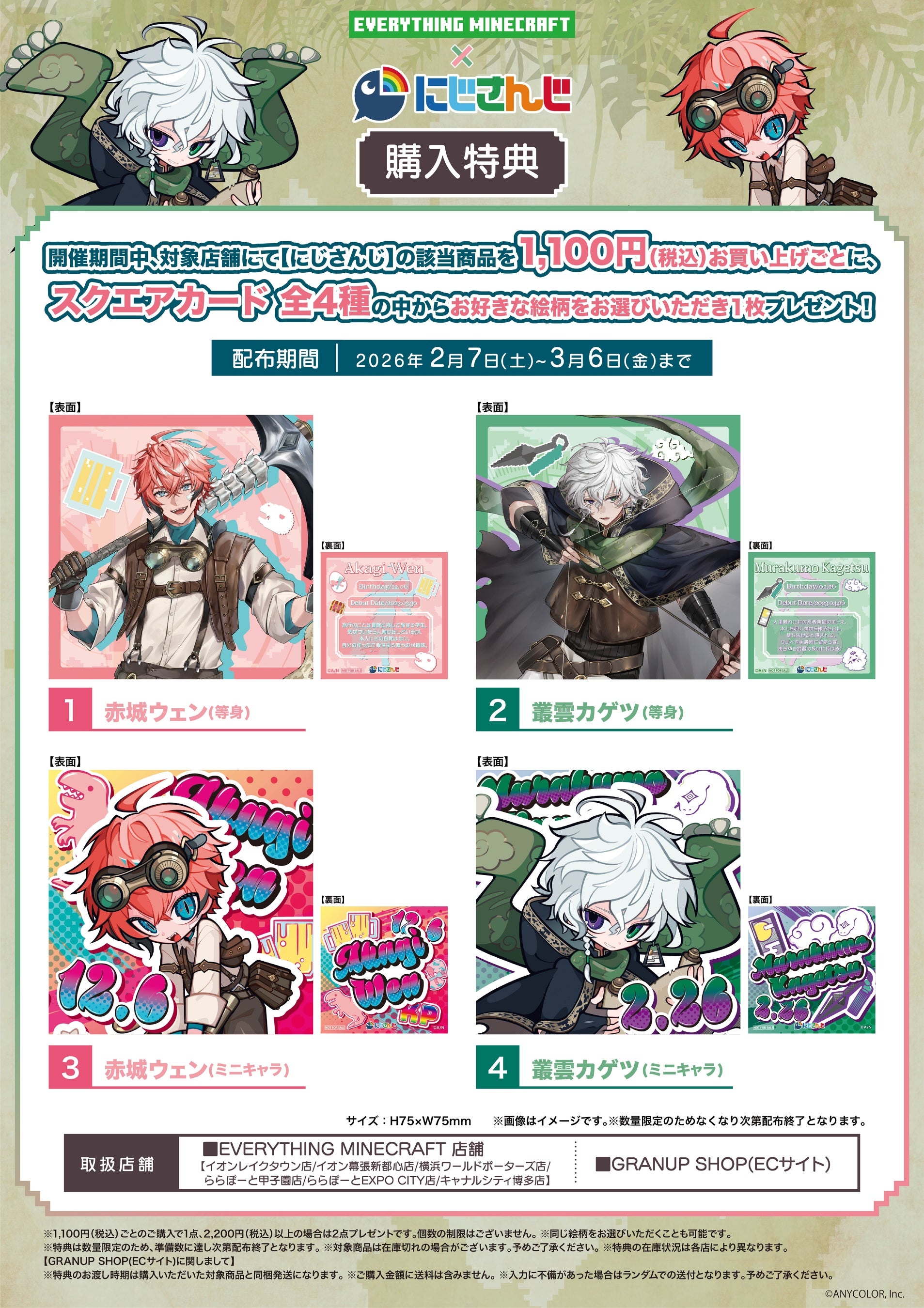 株式会社GRANUP (本社:千葉県松戸市 代表取締役:上野 綾介、以下「当社」)は運営するEVERYTHING MINECRAFT 一部店舗とGRANUP SHOPにて2026年2月7日(土)より、ANYCOLOR株式会社が運営するVTuber/バーチャルライバーグループ「にじさんじ」所属「赤城ウェン」「叢雲カゲツ」とのコラボレーションキャンペーンを開催いたします。
