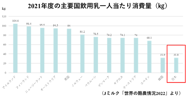 こんなにも栄養価値のある牛乳ですが実は日本の牛乳消費量は年間31.8kg、1日87mlと主要国の中でも少ないのが現状です。さらにコロナ禍によって学校給食がストップした際には、牛乳余りが問題視され牛乳の大量廃棄の危機が話題になっていました。こうした問題を解決するためにも、牛乳の安定的な消費拡大につながるよう、毎日牛乳を飲む習慣づくりが必要であると考えています。