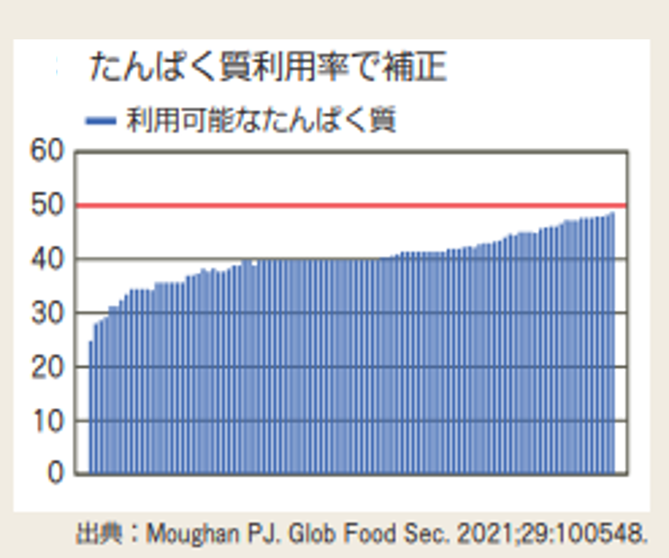 近年では摂取した「たんぱく質」の単純な量ではなく、そのうちの「利用可能なたんぱく質の量」で評価するDIAAS(消化性必須アミノ酸スコア)が新しい評価基準として推奨されています。従来の総たんぱく質計算では主要103ヵ国のほとんどが必要摂取量を超えているとされていましたが、DIAASに基づいてたんぱく質摂取量を再計算したところ、実は利用可能なたんぱく質摂取量が必要量を満たしている国は主要103ヵ国中1国もないということが分かりました。その中で牛乳に含まれるたんぱく質はDIAASにおいて大豆などの植物性たんぱく質より高いスコアを示しており、優れたたんぱく源として栄養価値が高い食品だといえるでしょう。