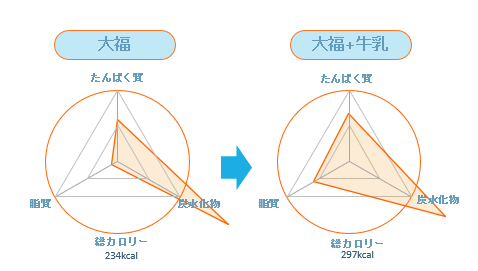 このレシピは大福に牛乳をプラスしてひと手間加えるだけで各栄養摂取量が大幅にアップします。また、大福だけだと摂取できる栄養素が炭水化物に偏っていますが、牛乳を加えるだけでPFC(たんぱく質、脂質、炭水化物)バランスが良くなり、高GI(※)食品+低GI食品で急激な血糖値の上昇を抑える効果もあります。そして何より美味しさもアップし、まさにこの「牛乳おしるこ」はミル活レシピの代表例といえます。