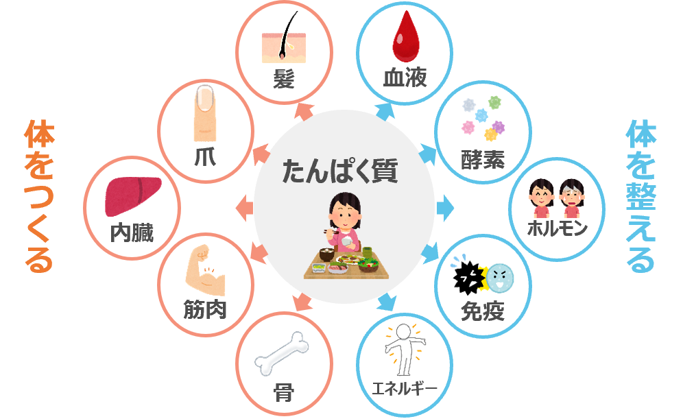現代日本人のたんぱく質摂取量は、戦後間もない日本全体が疲弊していた1950年代並みに低下している現状があり、これは痩身願望による過剰なダイエット、高脂肪・高炭水化物のインスタント食品の普及が原因として考えられます。たんぱく質は筋肉の維持だけに必要なのではありません。実は内臓や骨、血液など私たちのカラダのほとんどがたんぱく質からできており、代謝や免疫などを調整するホルモンや酵素までもたんぱく質がないと作り出すことができないのです。また、たんぱく質は炭水化物や脂質と同じく体を動かすエネルギー源にもなるため、常に多彩な働きをしている重要な栄養素であるといえます。